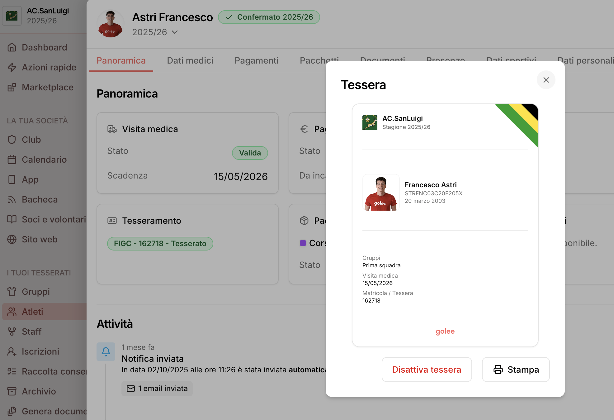Una volta creato il documento lo potrai stampare o salvare nella sezione riservata all'archivio documenti del tesserato. Così facendo potrai trasmetterglielo per email quando vuoi.