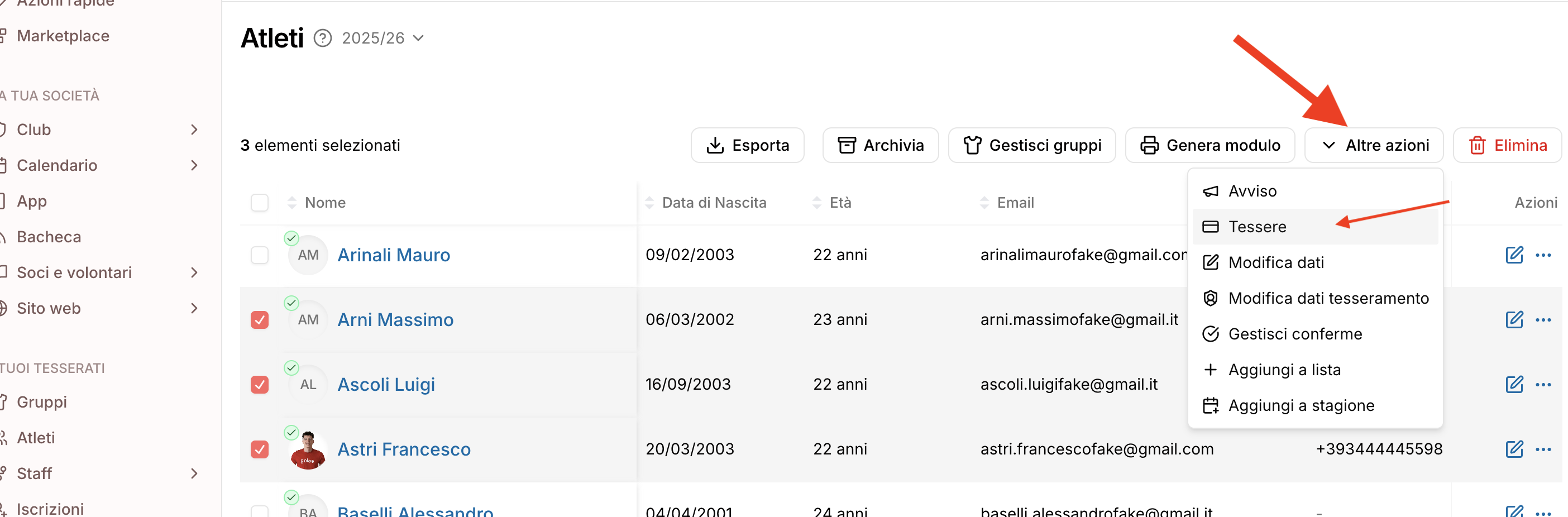Selezionando più anagrafiche contemporaneamente potrai cliccare sulla voce "tessere" in alto e disabilitarle o abilitarle massivamente: