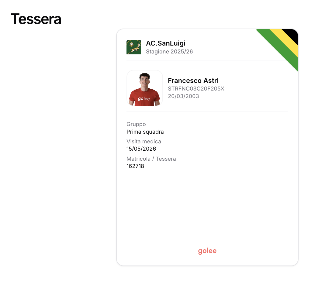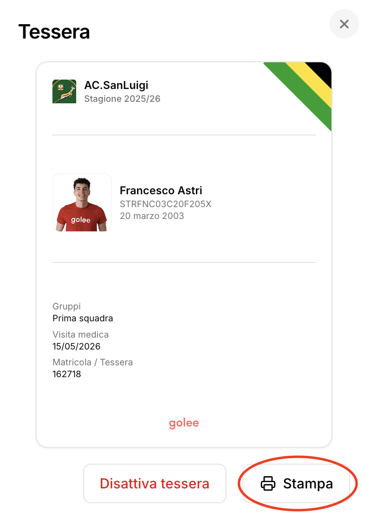 Se il tesserato non ha il profilo in APP ma vuoi comunque condividergli la tessera sociale puoi farlo cliccando su "stampa" proprio sotto alla tessera: