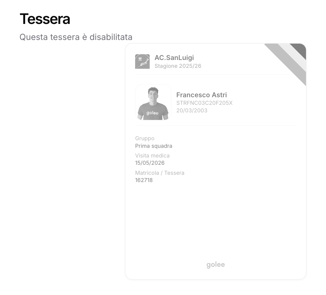 In base a se la tessera è abilitata o disabilitata, il tesserato nella sua sezione "tessera" del profilo in APP la vedrà in due diverse modalità.