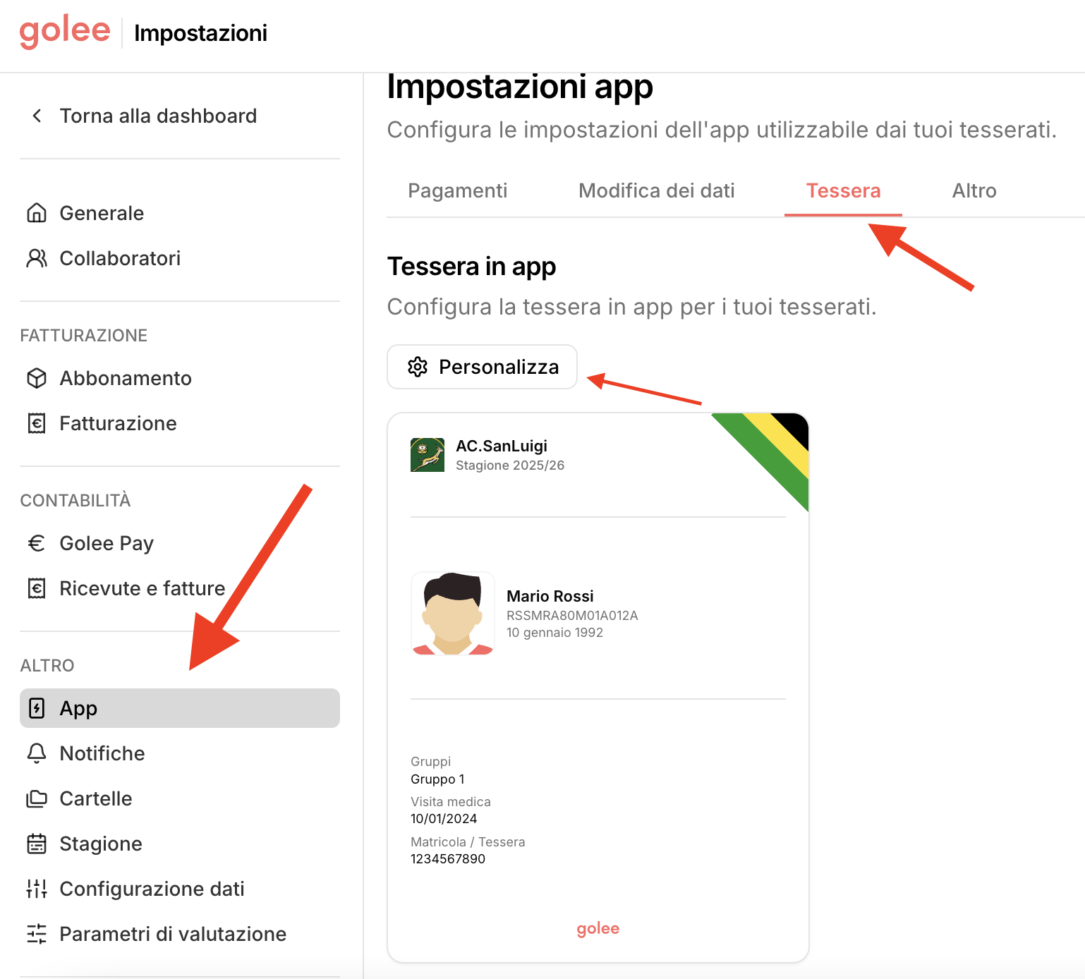 Puoi decidere quali informazioni del tesserato / iscritto mostrare nella sua tessera sociale, per personalizzarle clicchi sul "profilo -> impostazioni" in alto a destra nel tuo gestionale, passi alla voce "APP" e dalla sottosezione "tessera" la personalizzi abilitando o disabilitando i dati disponibili: