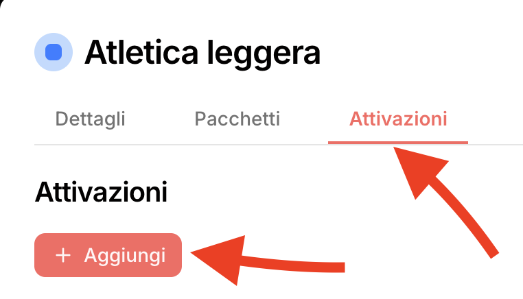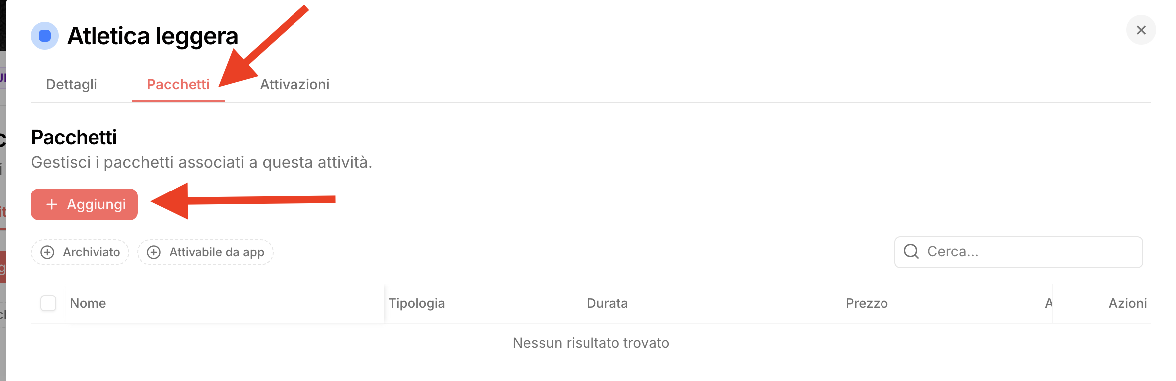 Cliccando su Pacchetti si potranno aggiungere tutti i pacchetti associati a una determinata attività es atletica leggera