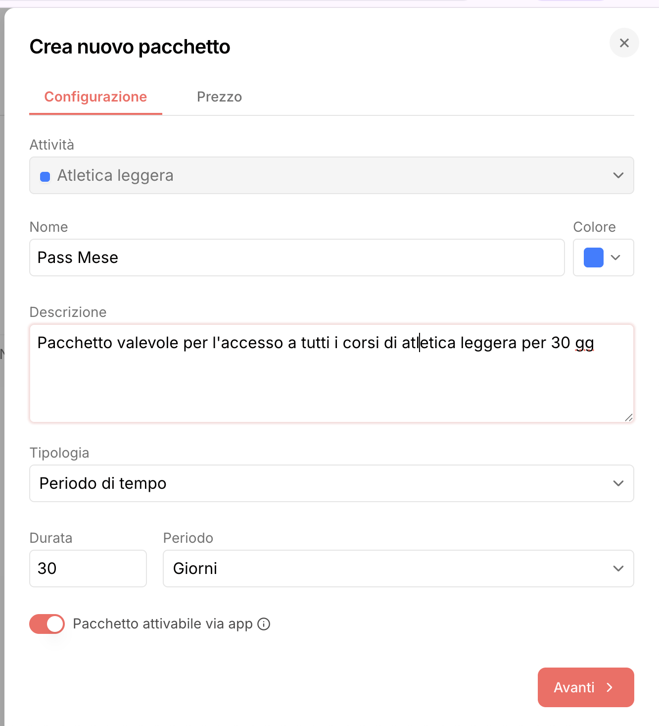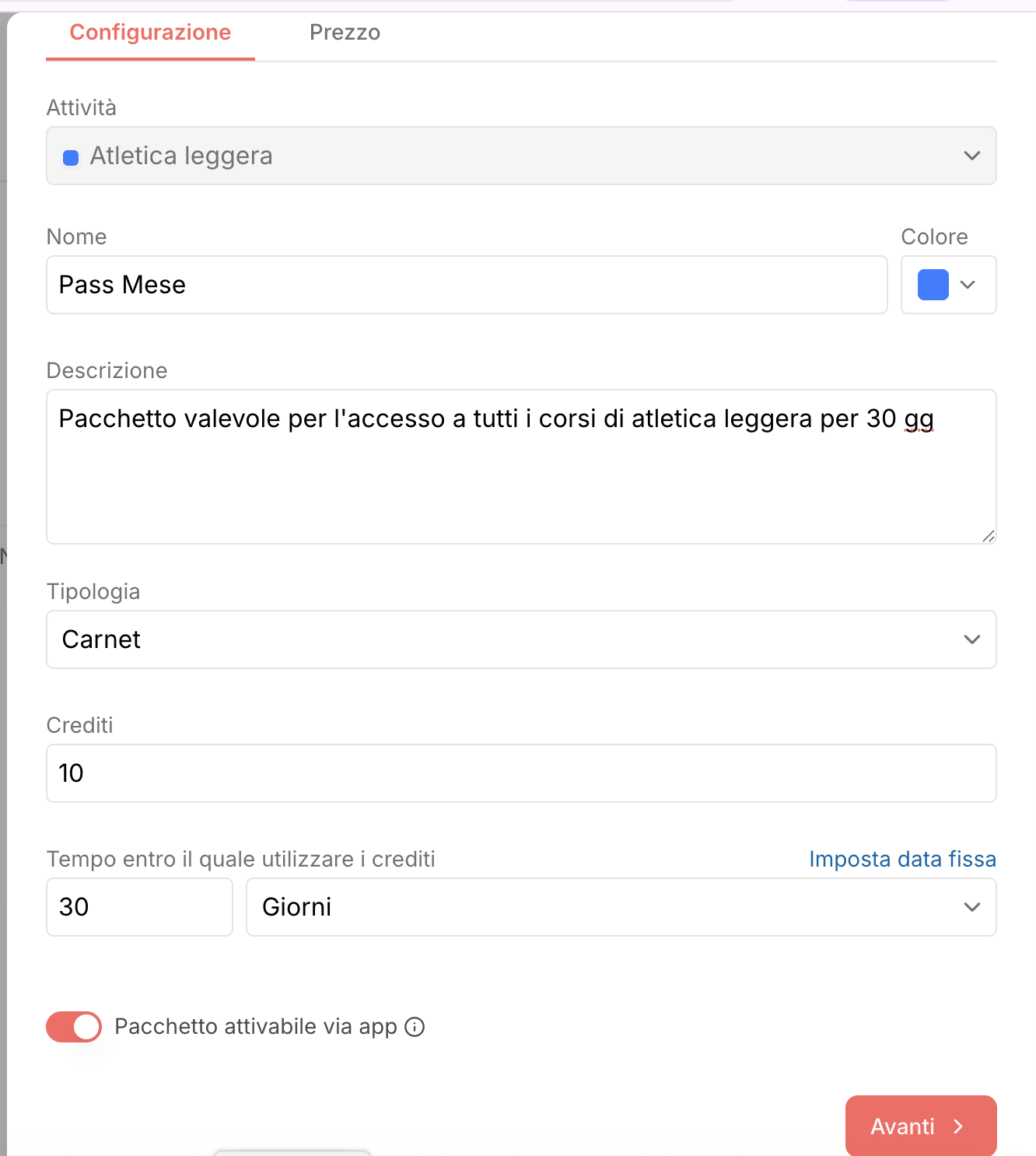 Cliccando su Aggiungi, si aprirà una finestra con la configurazione del pacchetto e anche il relativo prezzo da associarvi. Infine, in basso avrete la possibilità di dare l'opzione ai vostri tesserati "Attivabile via app".