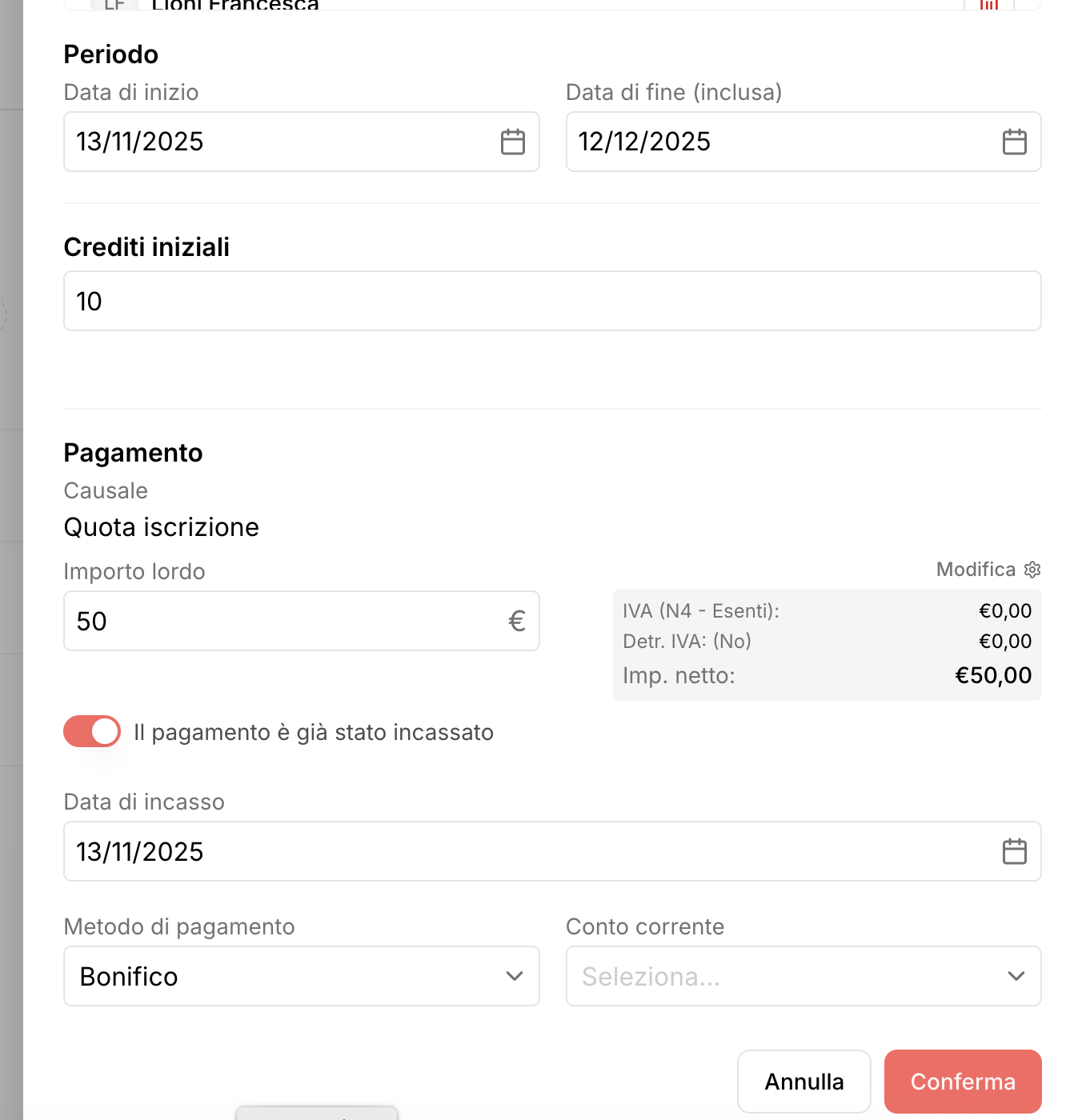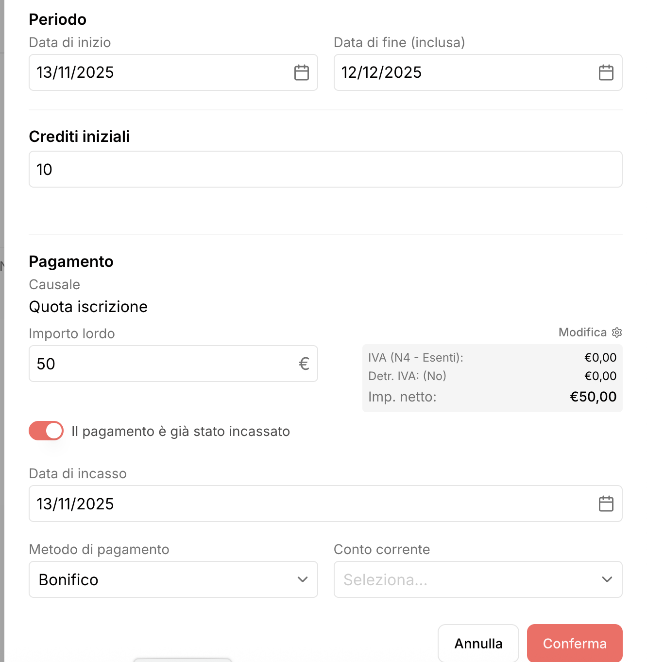 Lo stato del pagamento: gli/lo iscritti/o che sta attivando quel pacchetto, lo ha/hanno già pagato? lo potrai specificare in questa fase per aggiornare il suo stato pagamenti.