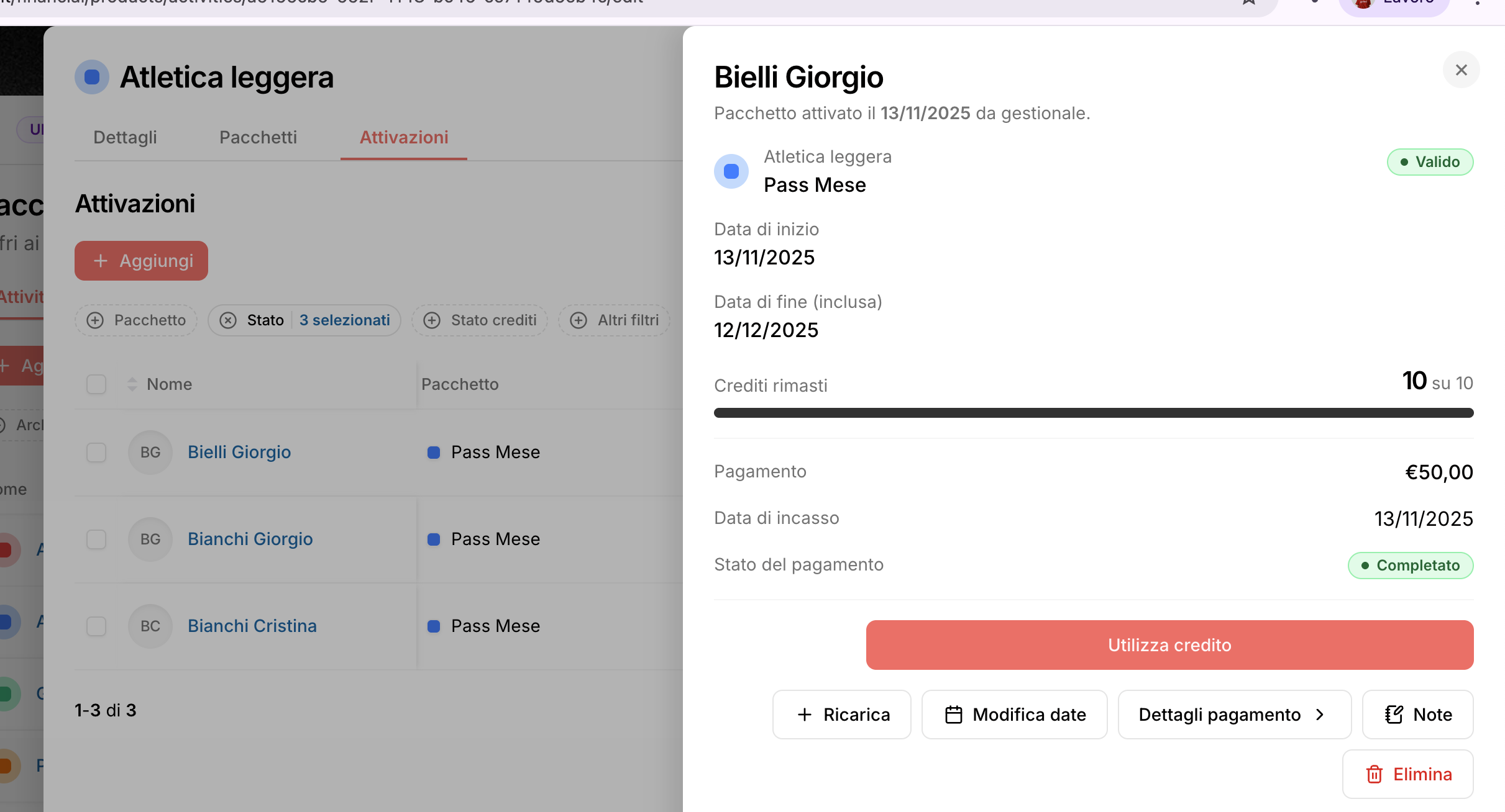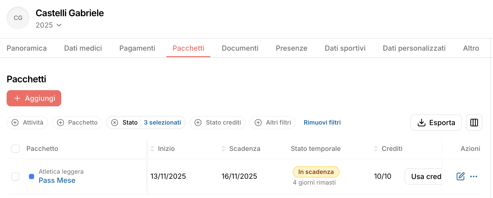 Se necessario, puoi anche aggiungere crediti tramite il pulsante "Ricarica", utile quando il tesserato estende il pacchetto.