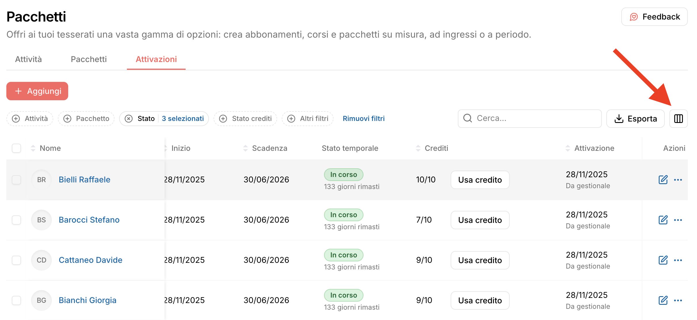 - Spunta i tesserati a cui vuoi attivare il pacchetto.