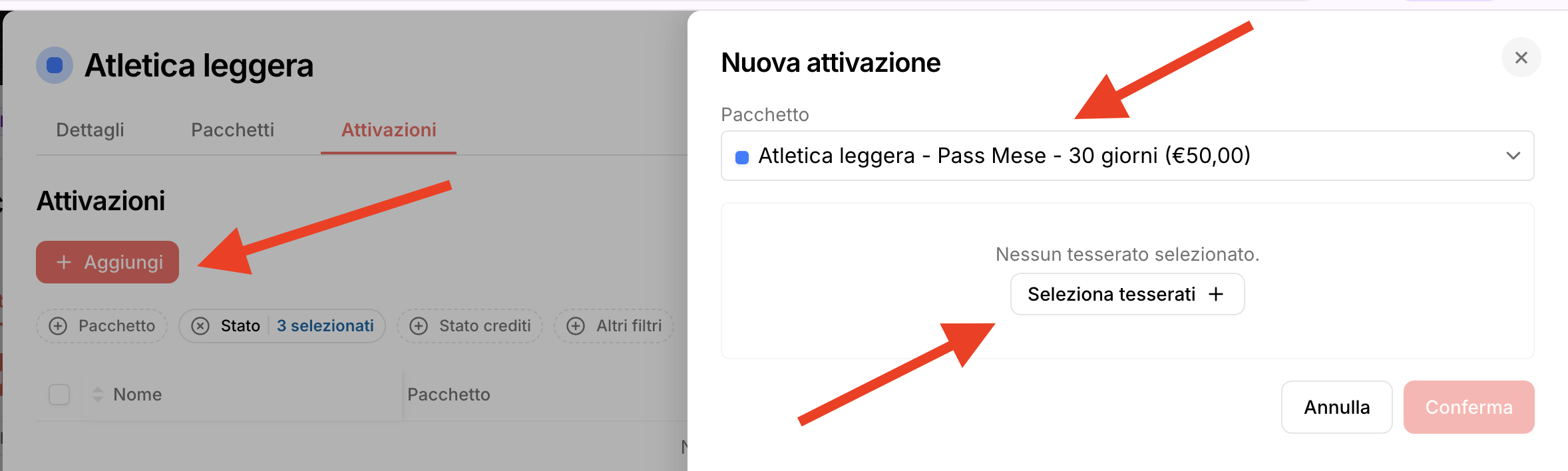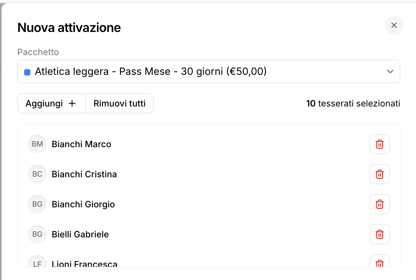 Una volta inseriti i tesserati, avrete la possibilità di personalizzare il periodo di attivazione, i crediti e il pagamento per quei tesserati che avranno attivato il pacchetto in quel frangente.