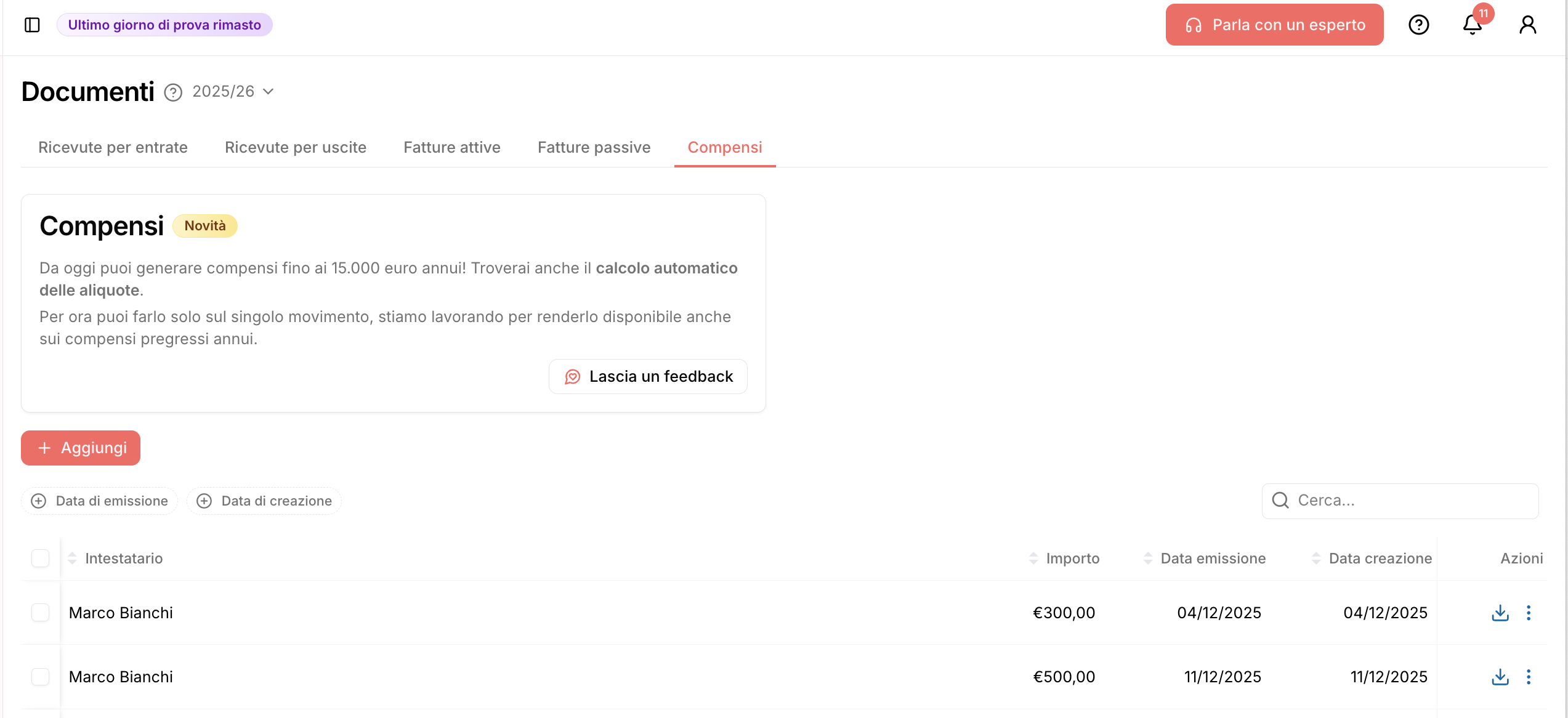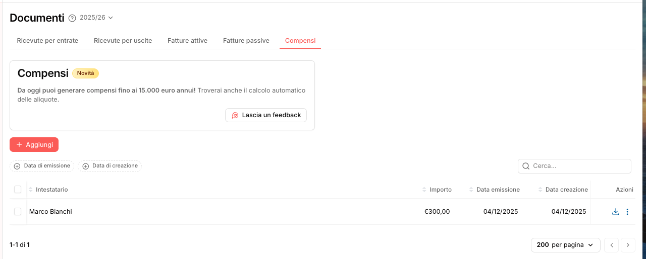 Nella sezione apposita in area finanziaria "Contabilità" sotto la voce “Documenti -> Compensi” potrai eliminare i compensi o scaricarli come PDF.