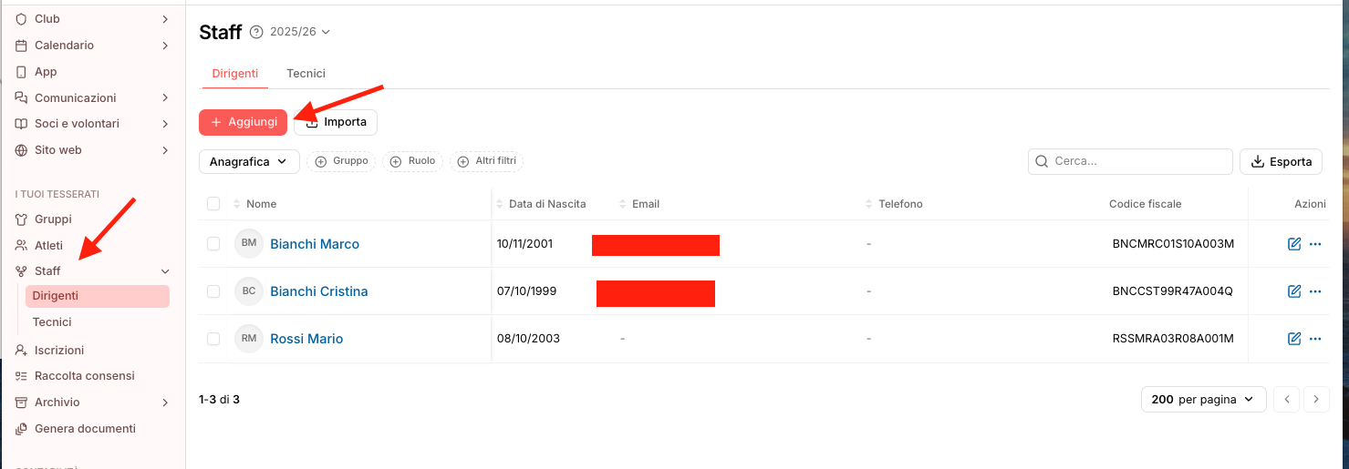 Prima di poter registrare un compenso, è indispensabile che la persona a cui dovrà essere generato sia stata inserita nella sezione Staff.