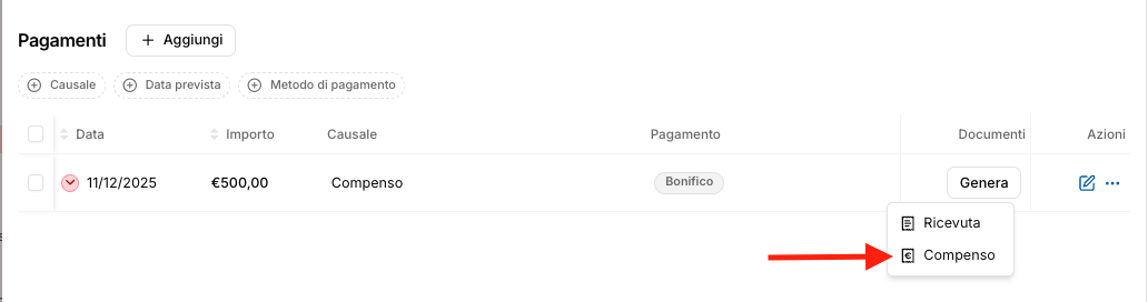 Registrando un'uscita come viene spiegato già in questo paragrafo, è possibile poi generare un compenso per la stessa rata. Cliccando su Genera > Compenso come in figura, si accede alla pagina di generazione del documento.
