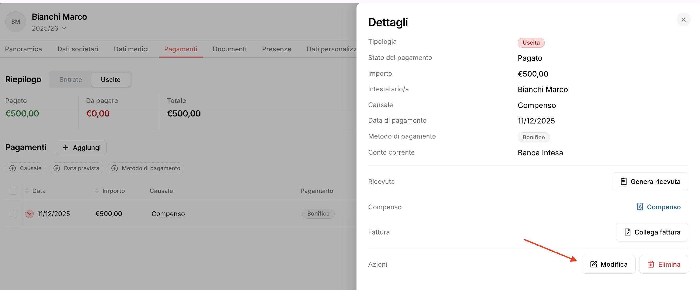 Per atleti o staff è possibile registrare uscite per compensi e rimborsi spesa direttamente nella sezione "pagamenti" della loro anagrafica.
