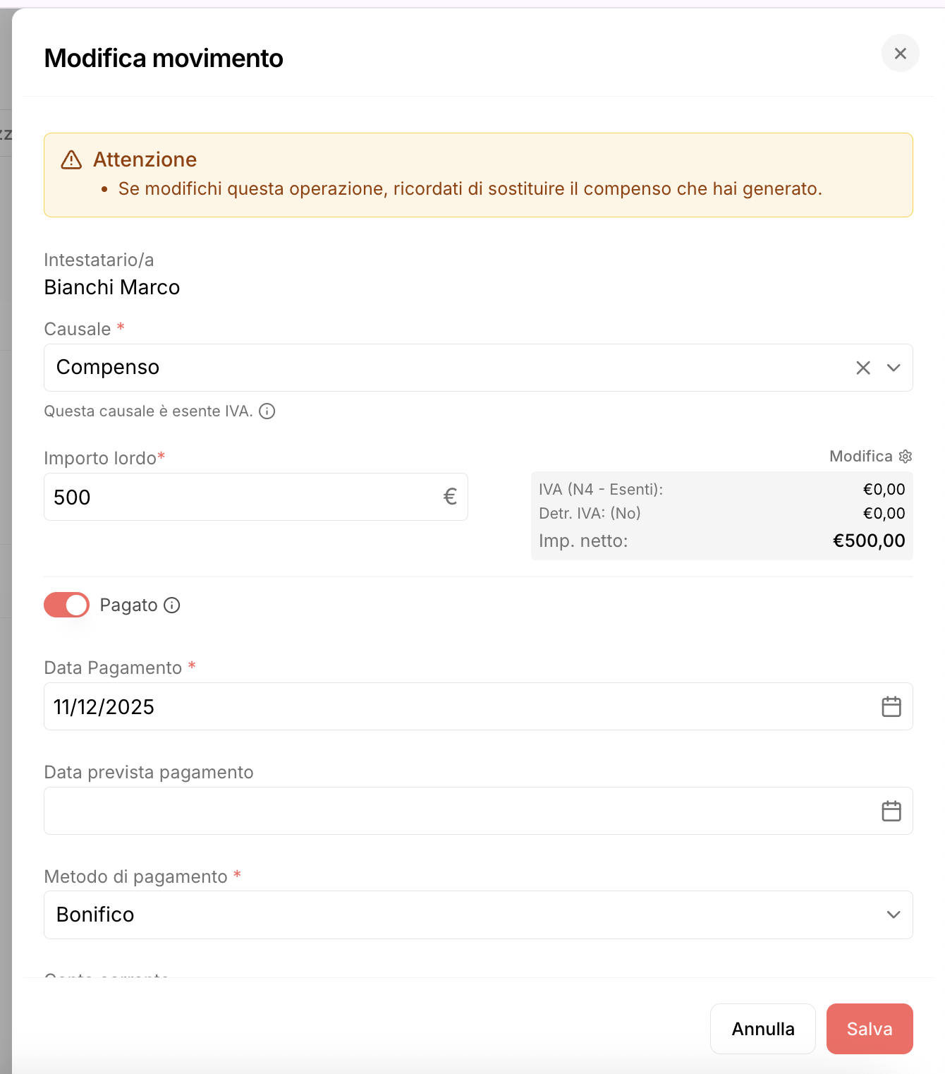 Come già avviene per gli altri movimenti, anche per i Compensi c'è la possibilità di modificare i dati inseriti. Basterà andare nell'anagrafica del dirigente/tecnico, nella parte di pagamenti in uscita e nell'area azione cliccare su "Modifica" .