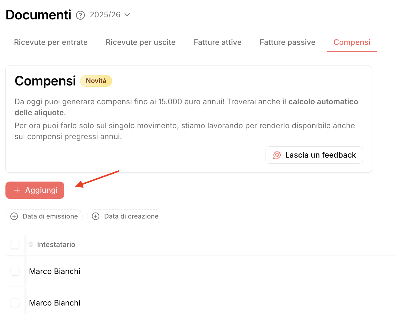 A questo punto si può impostare l’intervallo temporale di riferimento del compenso e la data di emissione del documento.