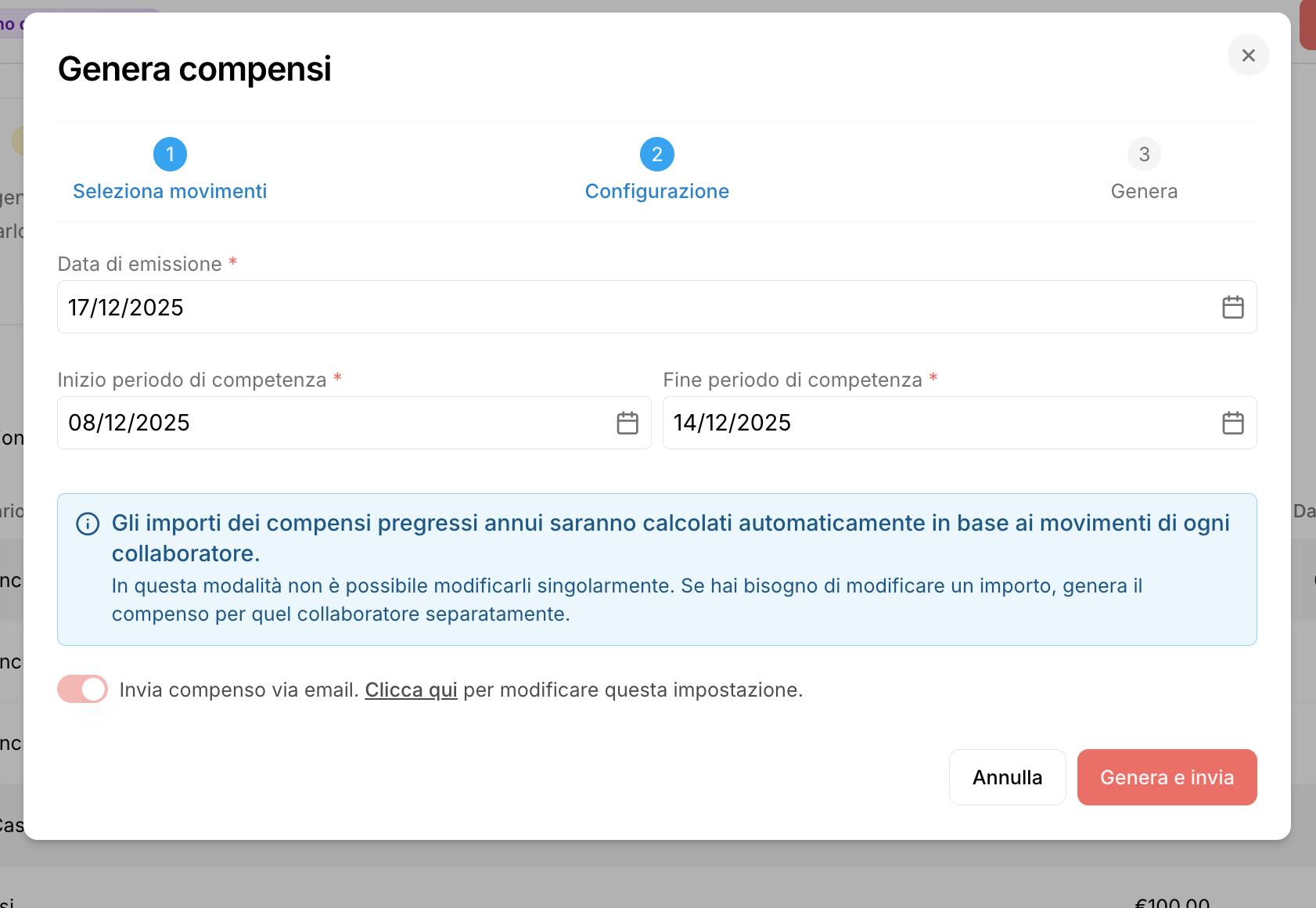Infine, cliccando su “Genera e invia”, il sistema produrrà e invierà automaticamente il compenso a tutto il personale selezionato. Potrete vedere questi compensi generati nell'area "Compensi"