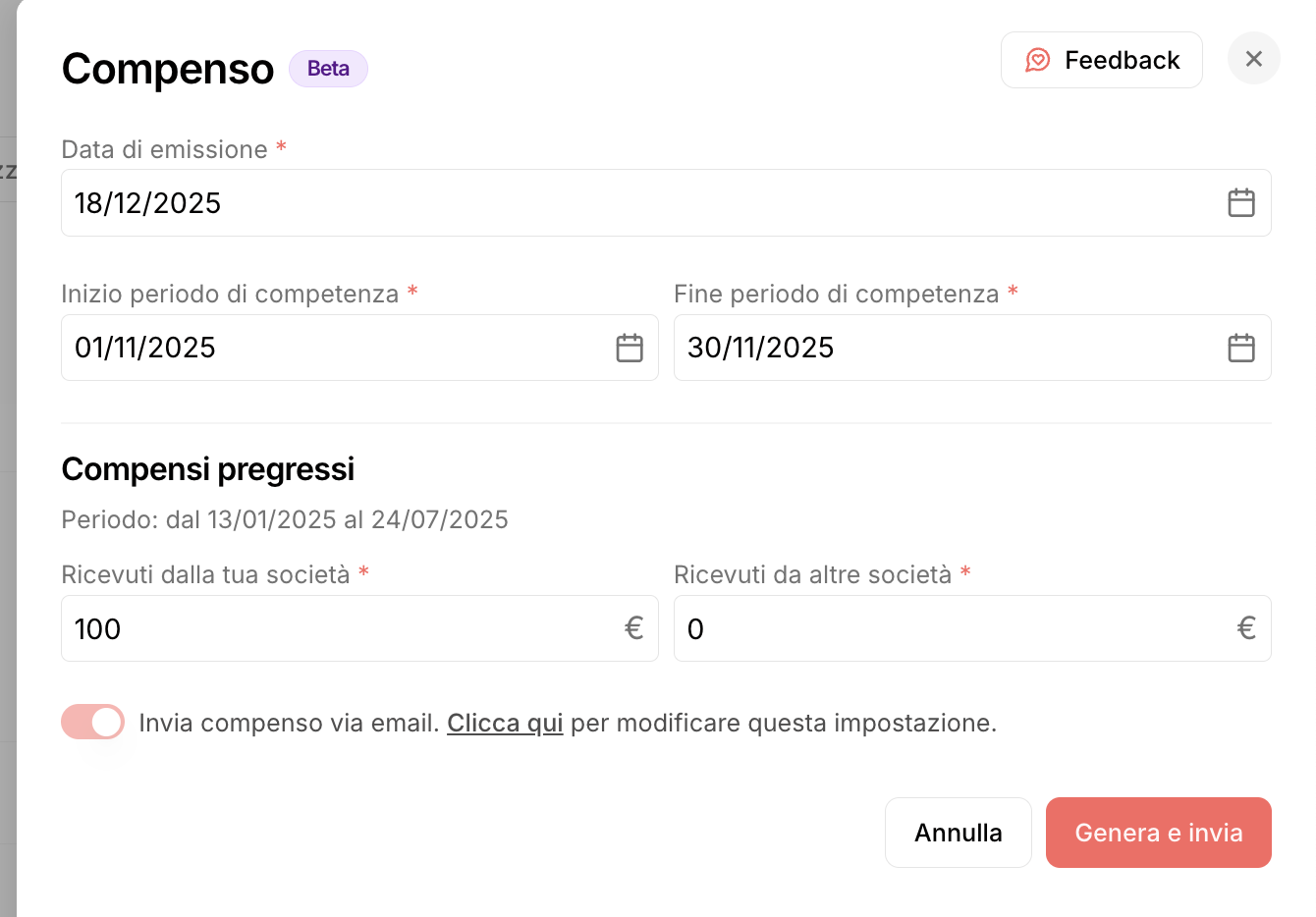 Una volta selezionato "Compenso" dovrete inserire il periodo di competenza e i compensi pregressi, sia ricevuti dalla vostra società che da altre, in modo che il documento generato sia completo. Per la generazione singola i compensi pregressi sono un campo modificabile, mentre per la generazione massiva no. Il calcolo delle aliquote conteggia tutti i compensi pregressi.