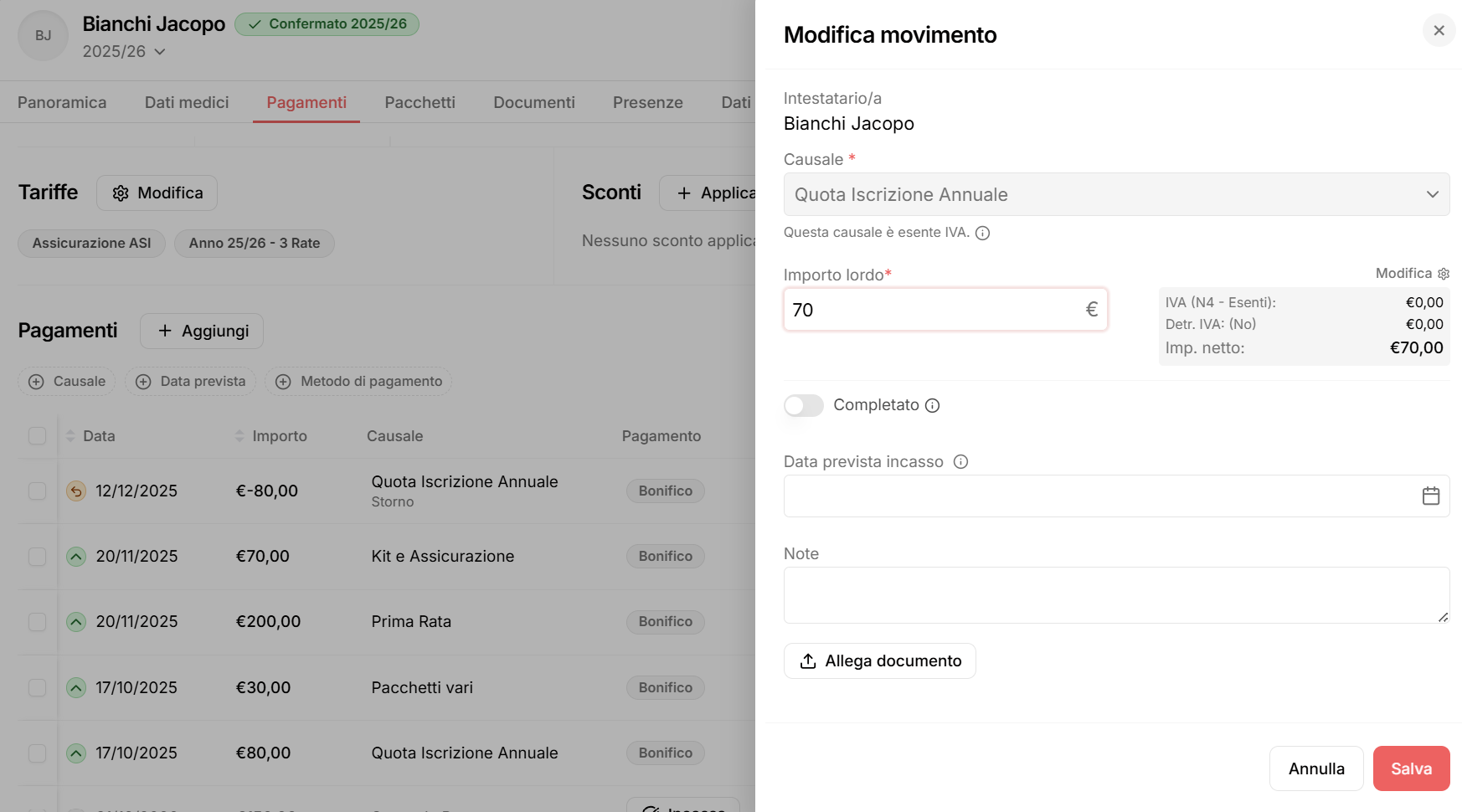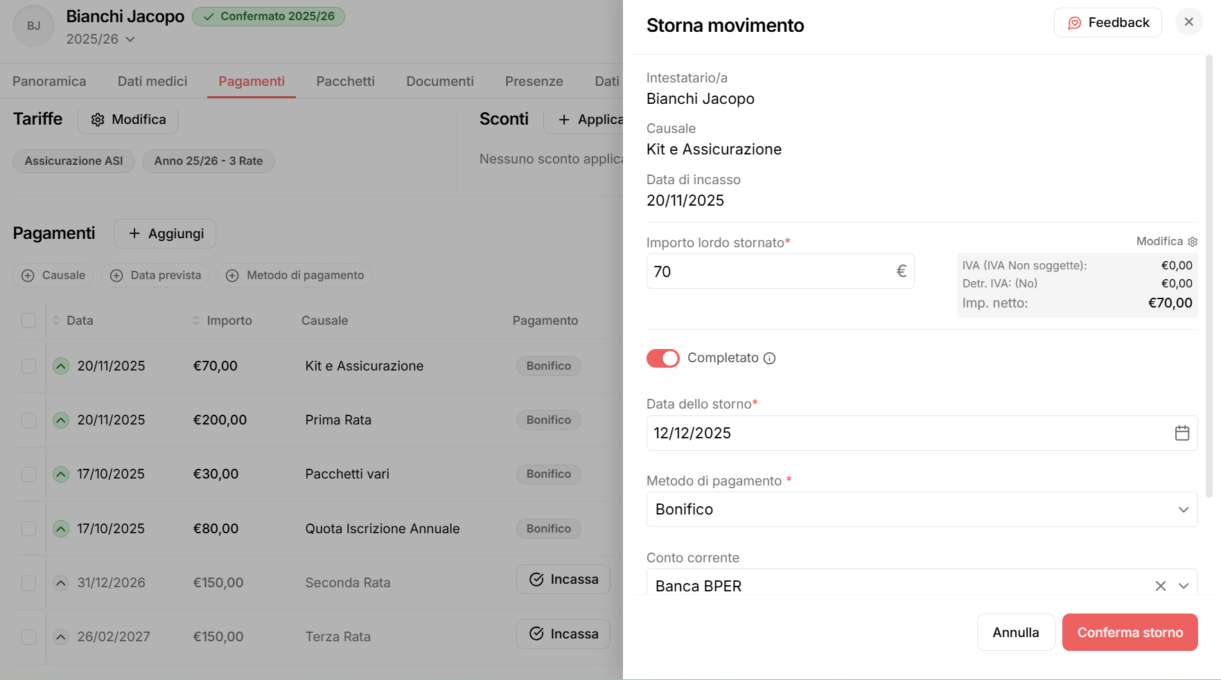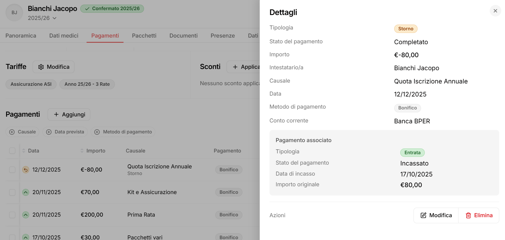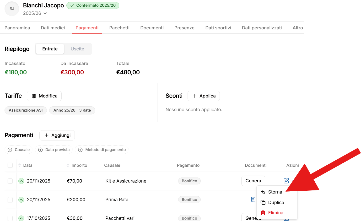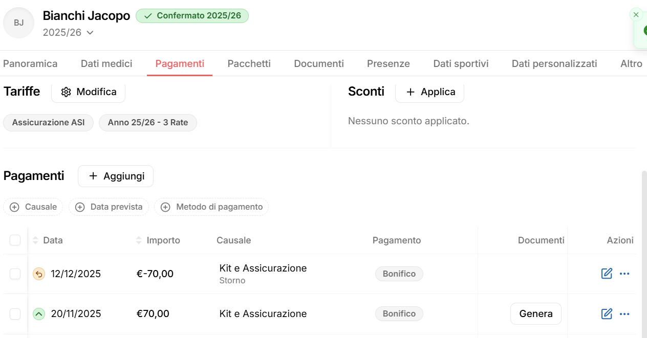 Una volta salvata l’operazione, il movimento di storno sarà visibile all’interno della sezione Pagamenti dell’anagrafica dell’atleta.