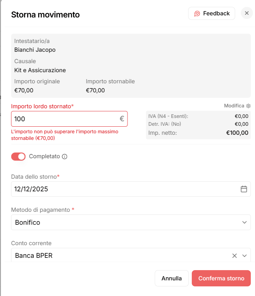 Se un pagamento è di 70 euro ma desideri stornarne solo 50, puoi inserire 50 nel campo Importo lordo stornato.
