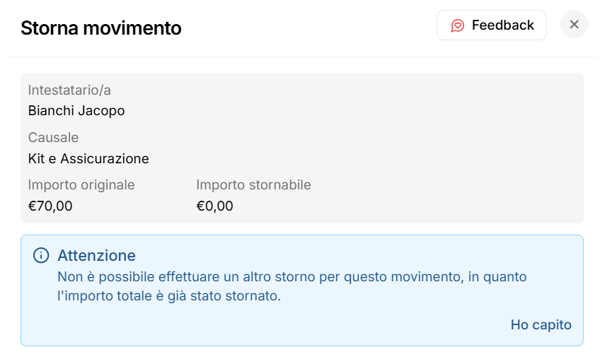 Una volta che l’importo è stato interamente stornato, il sistema non permette di eseguire ulteriori storni sullo stesso movimento.