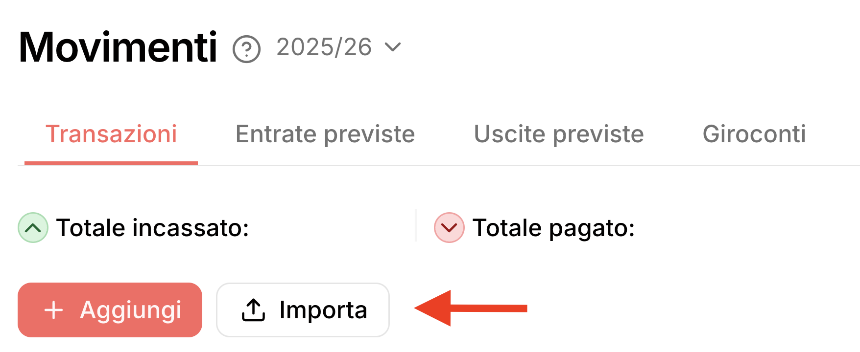 Per usufruire di questa funzione ti basta andare su Movimenti > Transazioni > Importa.