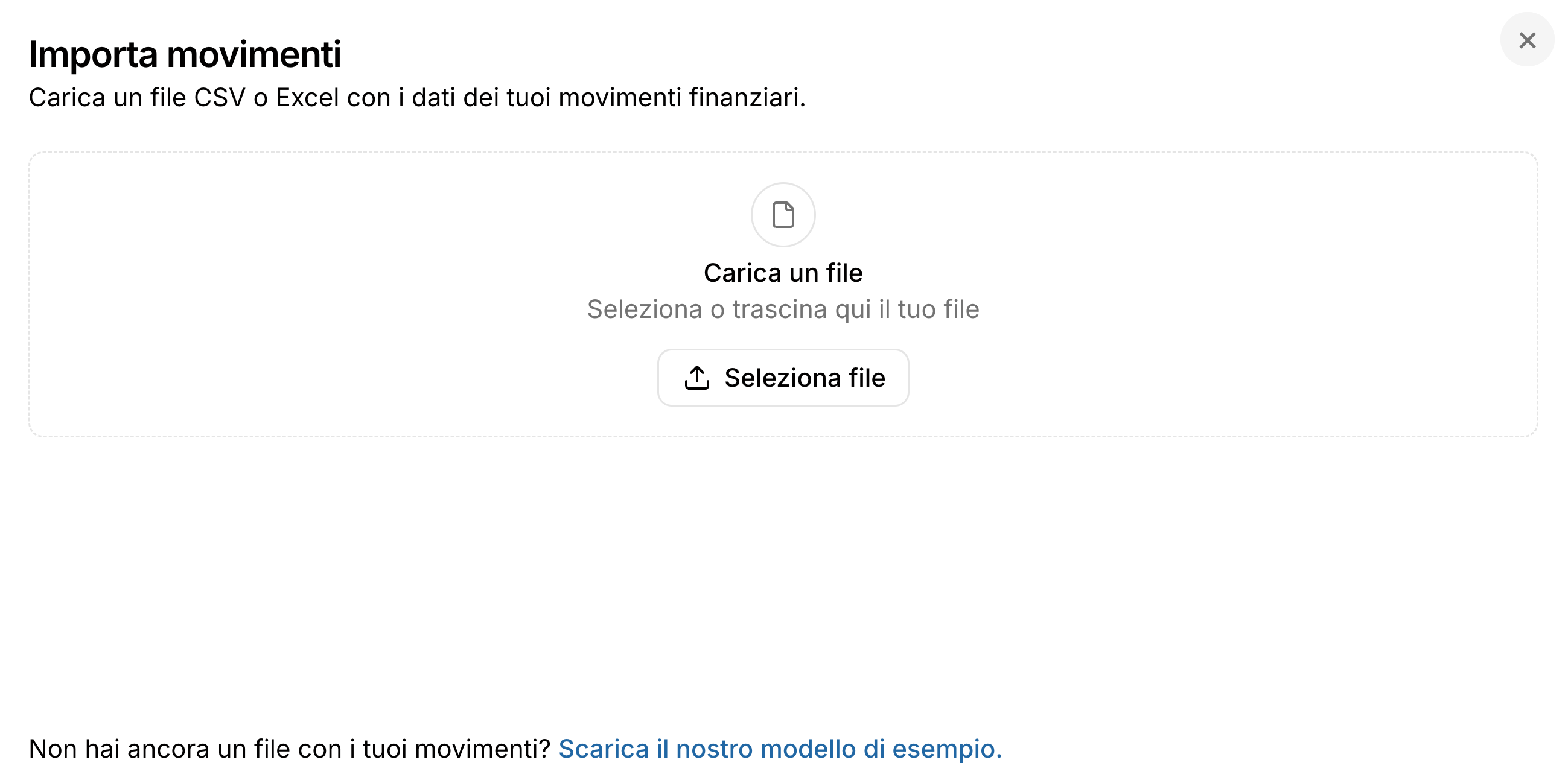 A questo punto vedrai una schermata che ti permette di caricare un tuo file - se ne disponi già - altrimenti, come per altre importazioni in Golee, potrai scaricare un nostro template con le colonne e le voci già pre-compilate. Ti basterà cliccare sulla frase Scarica il nostro modello di esempio.