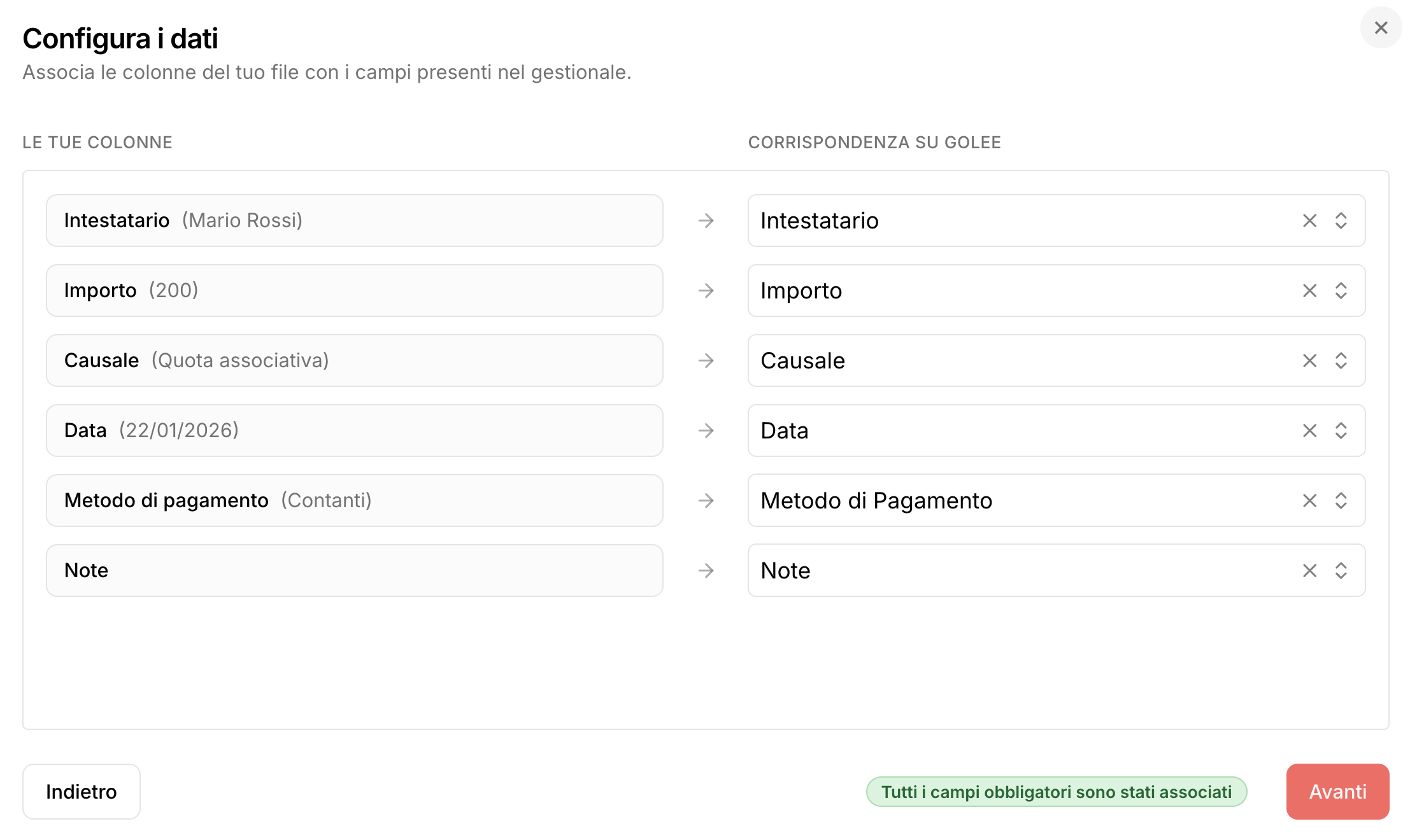 Una volta caricato il file il gestionale collega automaticamente le colonne excel alle voci corrispondenti su Golee. Se dovessi notare qualche incongruenza, puoi modificarla e aggiornarla.