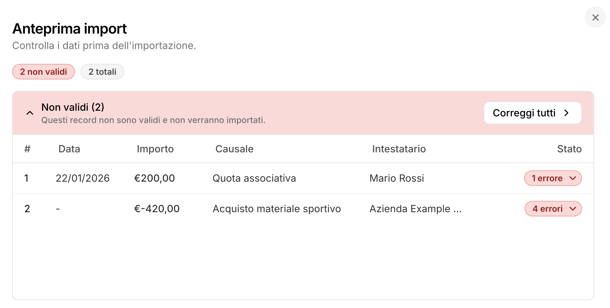 - I dati obbligatori per l'importazione sono intestatario, data, importo, causale e metodo di pagamento