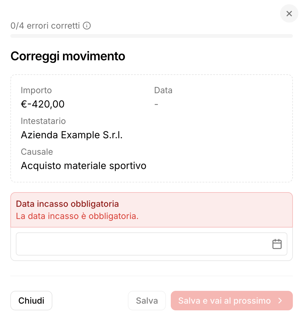 Nel secondo caso potresti non avere inserito all'interno del file la data di incasso in relazione a uno o più movimenti. Il gestionale ti permette di inserirla manualmente nella schermata correggi movimento.