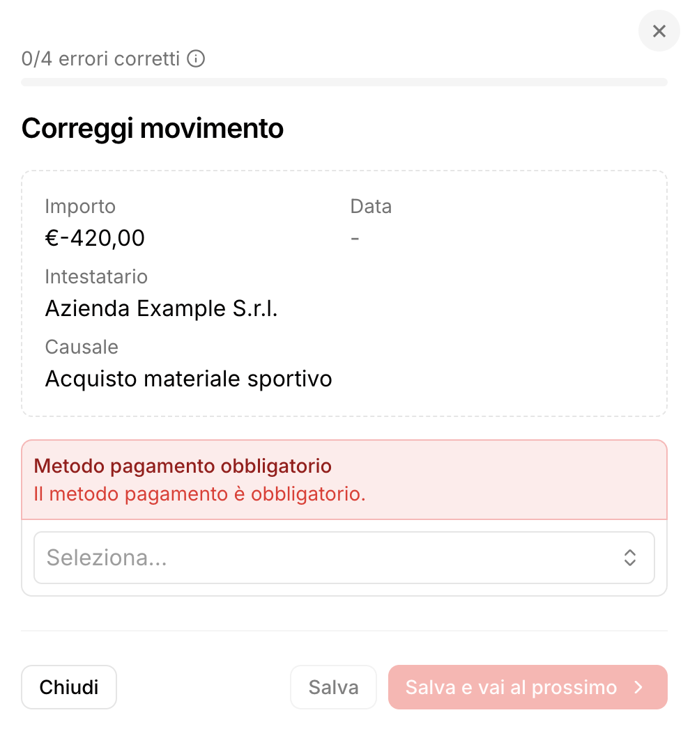 Anche il metodo di pagamento rappresenta un dato fondamentale per inserire una transazione all'interno di Golee. Puoi inserirlo successivamente tramite questa schermata se nel file c'è un'incongruenza che il gestionale non è riuscito a rilevare o è totalmente assente.