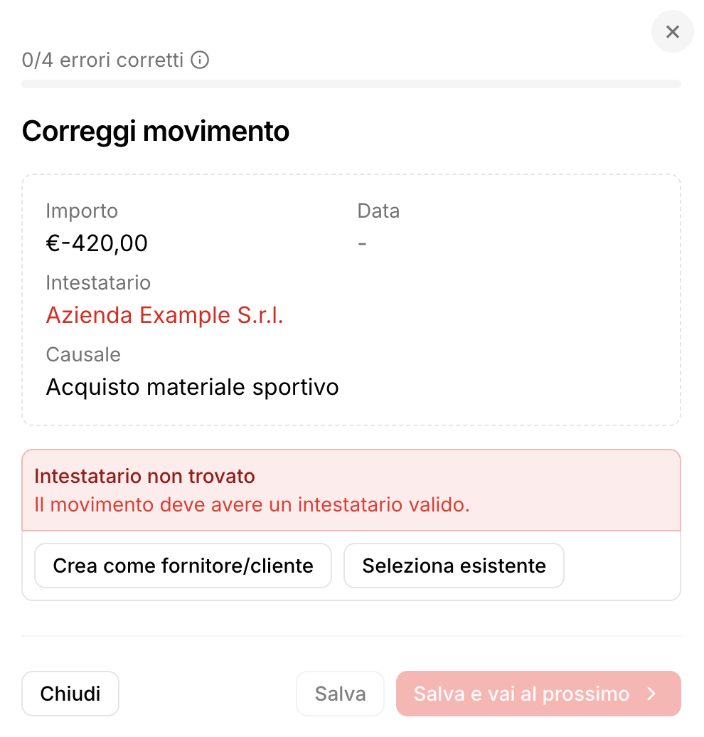 Allo stesso modo delle causali, anche nel caso in cui l'intestatario non combaci con le anagrafiche già inserite all'interno del gestionale, potrai: