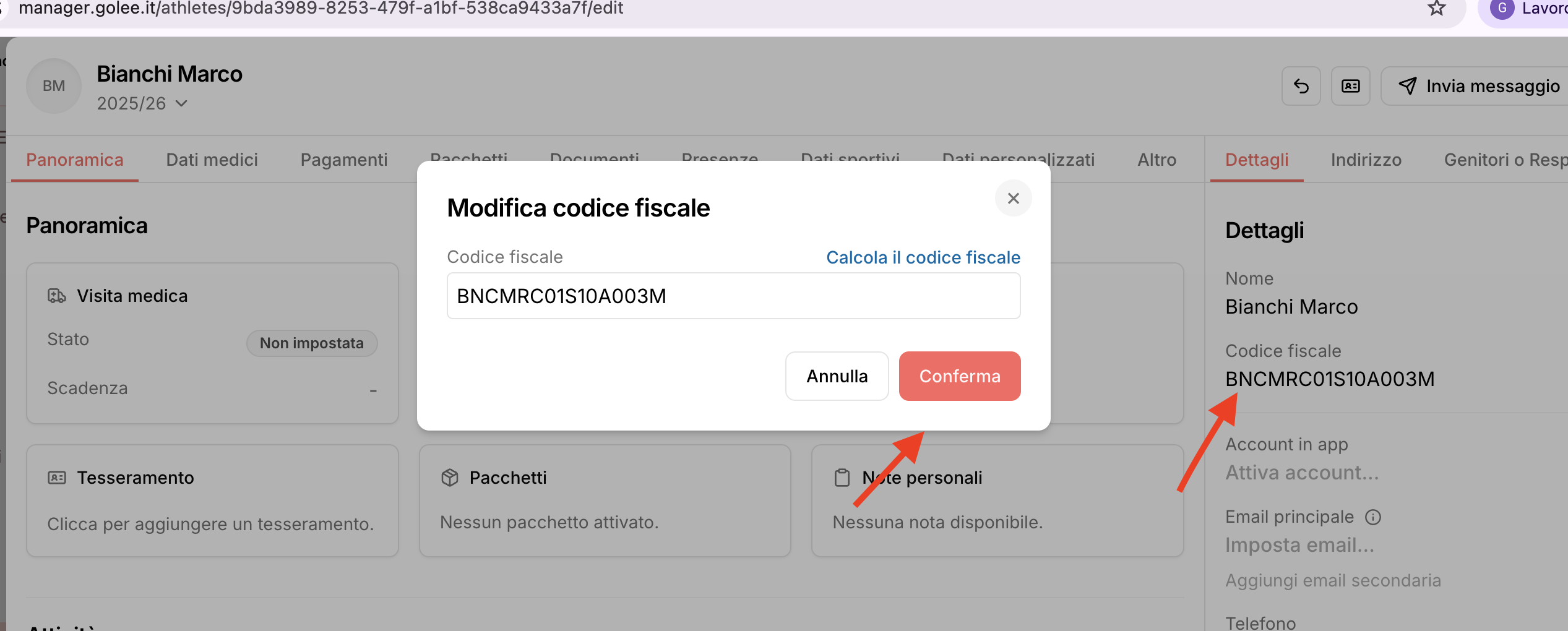 Come modificare il codice fiscale di un atleta