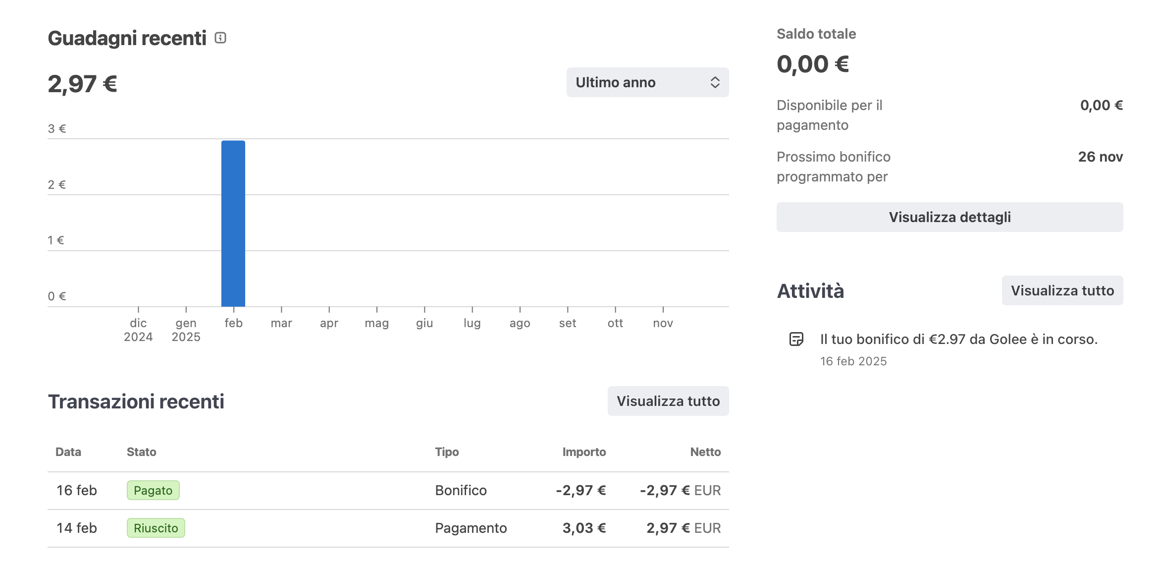 - Saldo totale: Corrisponde a cioè che è già stato versato su Golee Pay ed è in transito verso la tua banca (questo dato è importante perchè corrisponde alla prossima cifra che ti arriverà tramite bonifico sul tuo conto corrente)*