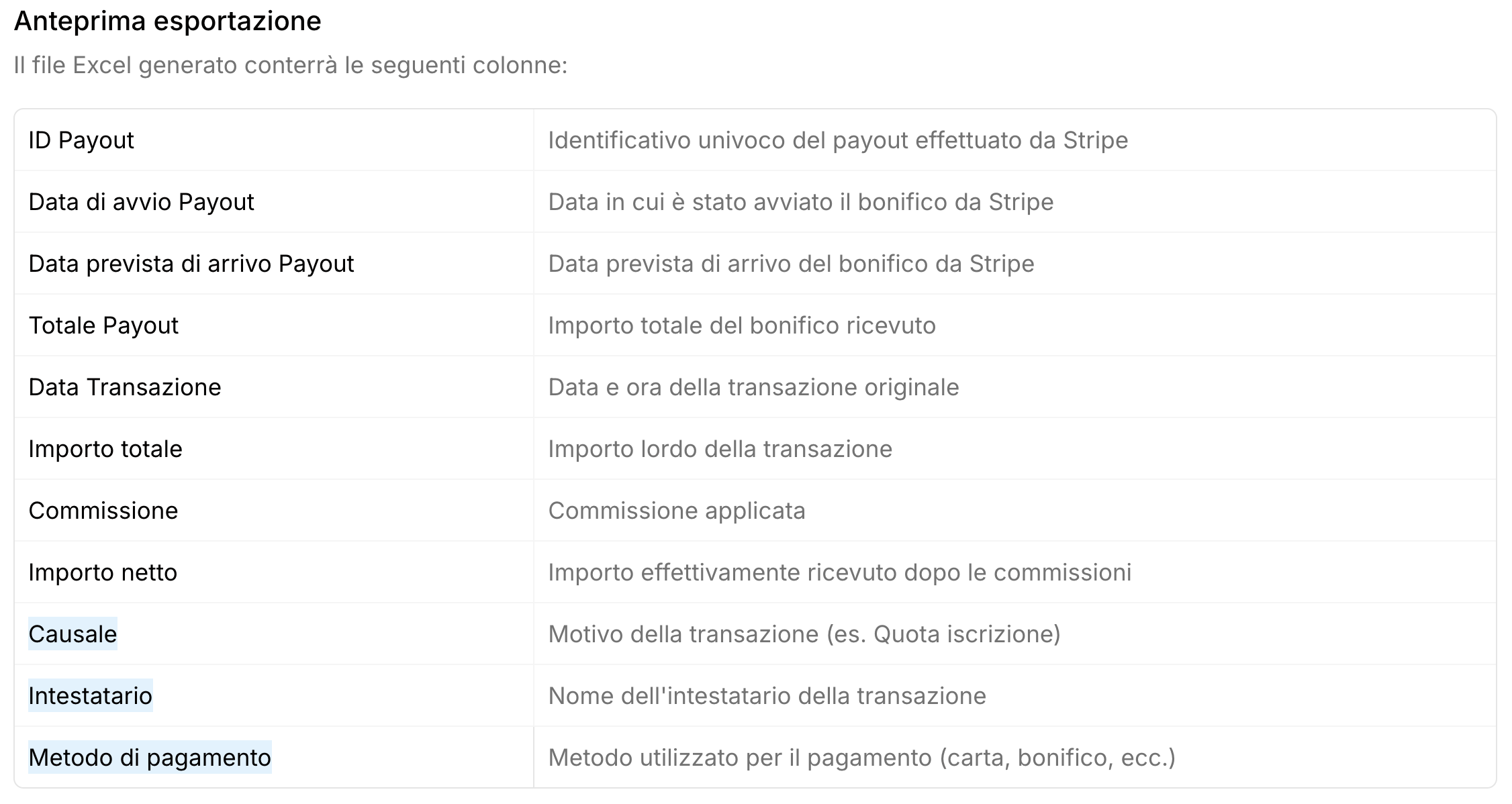 👀 Le ultime 3 colonne (Causale, Intestatario, Metodo di pagamento) sono i valori di riconciliazione che ti permettono di identificare e tracciare ogni operazione nel tuo sistema.