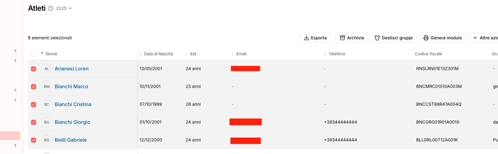 - Filtrate l'elenco atleti per tutti i gruppi che appartengono al "Macrogruppo" (Es. pallavolo u18, 17 ecc..)