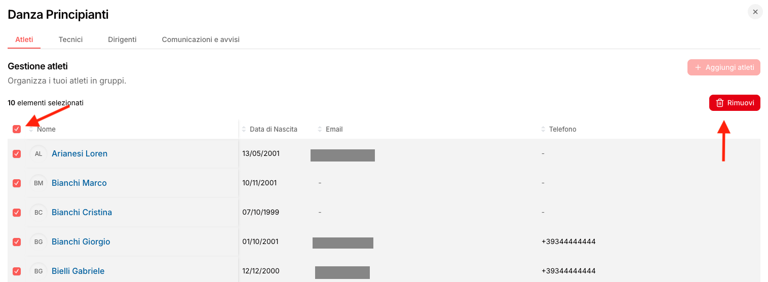 Attenzione! Il numero che visualizzi è il totale degli atleti, non include anche gli eventuali allenatori, ossia membri dello staff. Se hai provato a eliminare un gruppo senza atleti ma non riesci, prova ad andare nella sezione staff e filtrare per gruppo.