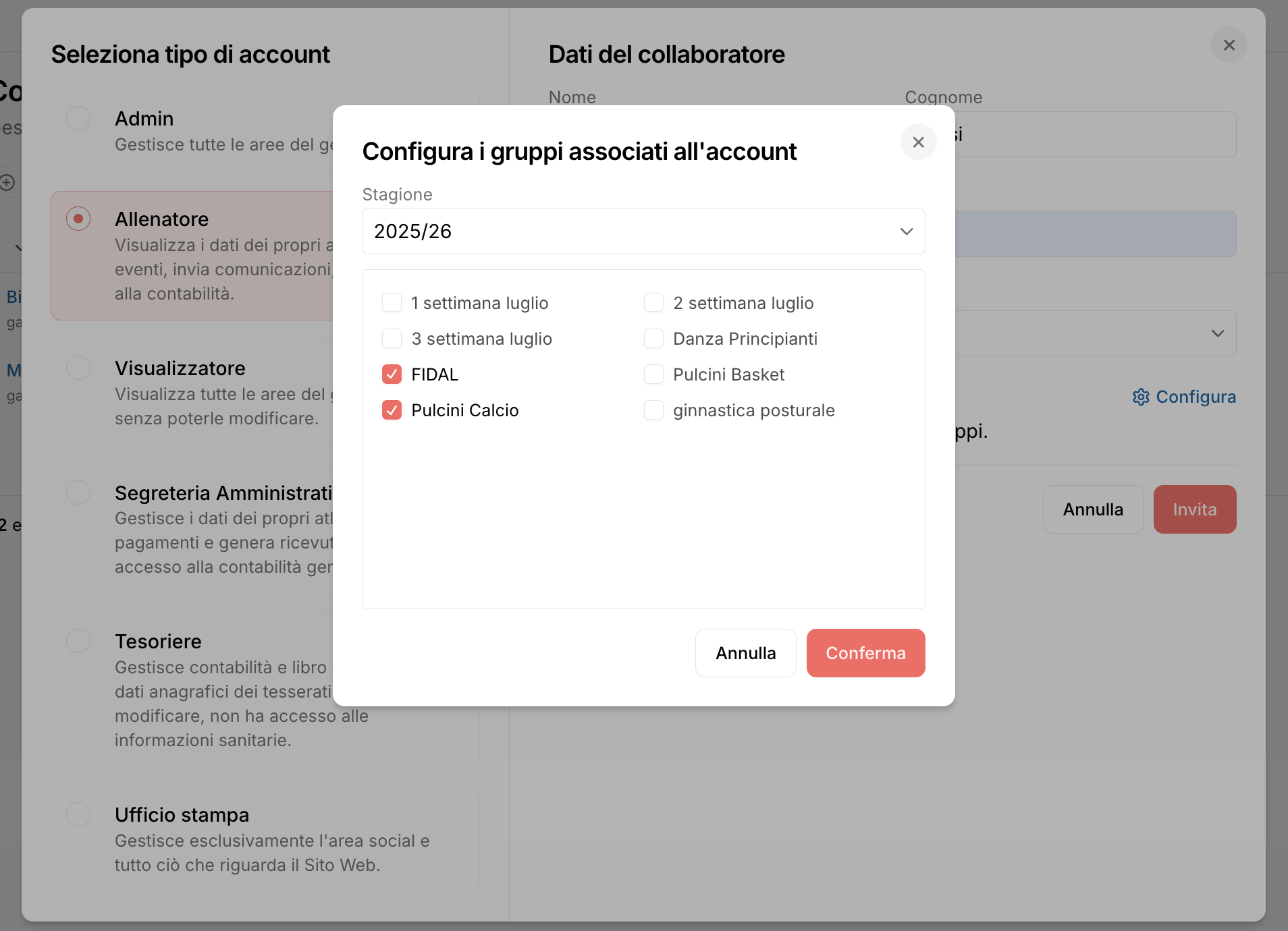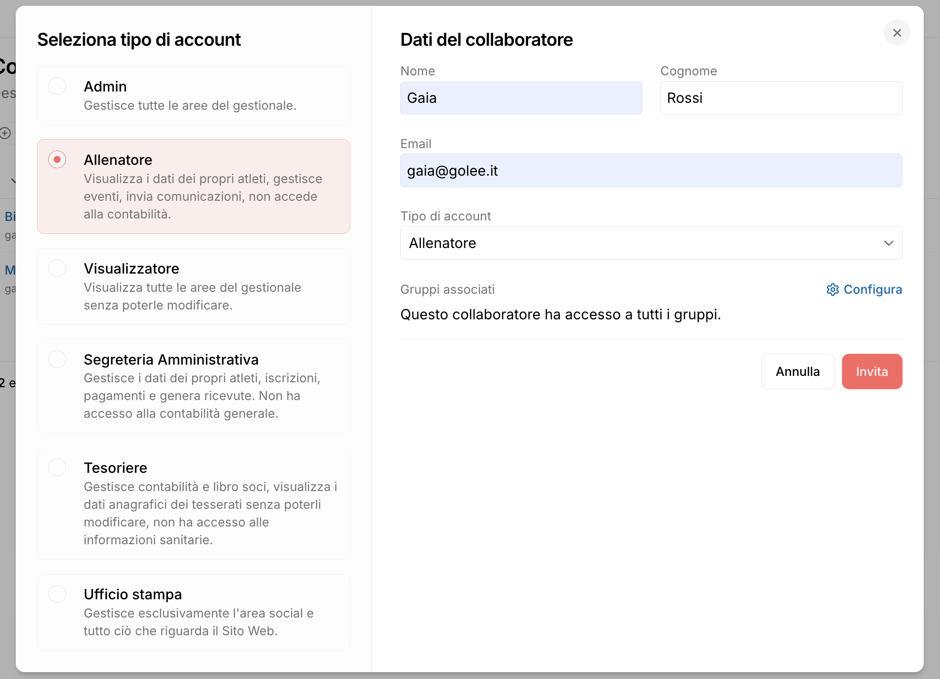 Come dare accesso ad un collaboratore che ricopre due ruoli (es. segretario e allenatore)