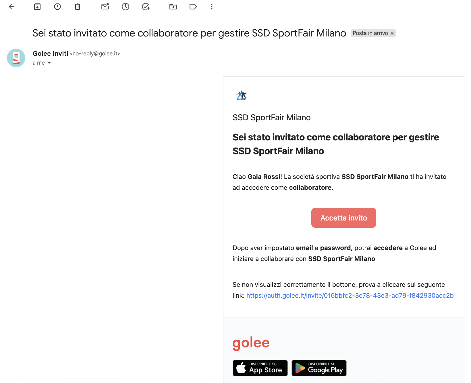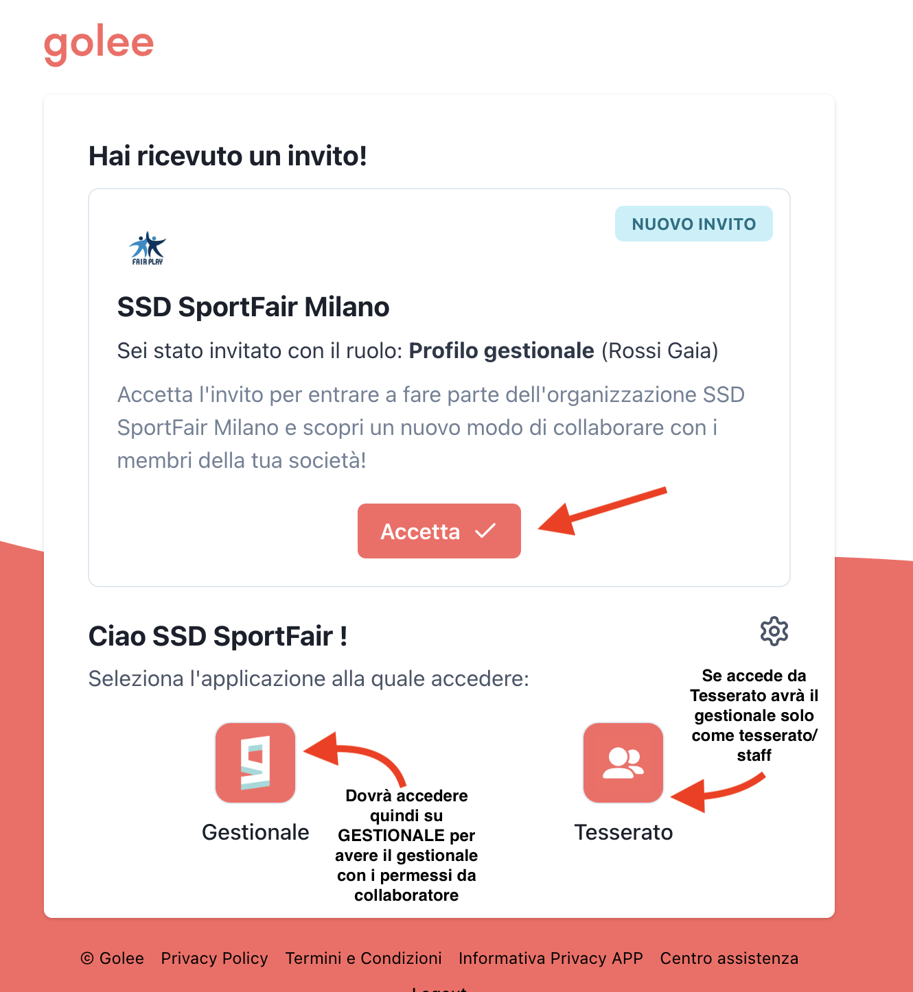 - Alla persona arriverà un invito via email che potrà riscattare, impostando una password di accesso personale. Se la persona è già registrata come tesserato, avrà un doppio accesso visibile come "tesserato" e "gestionale"