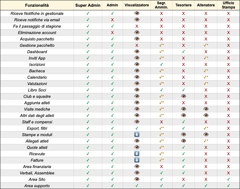 Le tipologie di account che consentono la modifica ed aggiornamento dei dati (Admin, Segreteria, Allenatore) hanno una logica di permessi "piramidali" che ti consentono di attivare un collaboratore alla gestione di più ruoli, creando un account unico. L'ordine dei ruoli è il seguente: