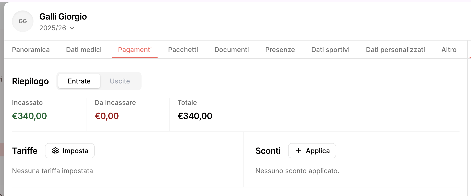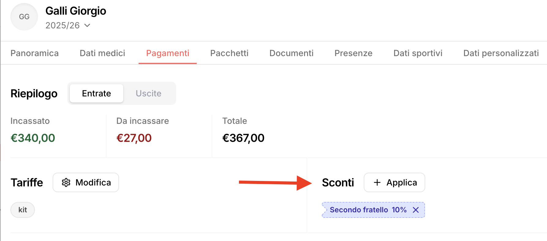Per assegnare uno sconto ad un tesserato ti basterà andare nell’area pagamenti di un tesserato.