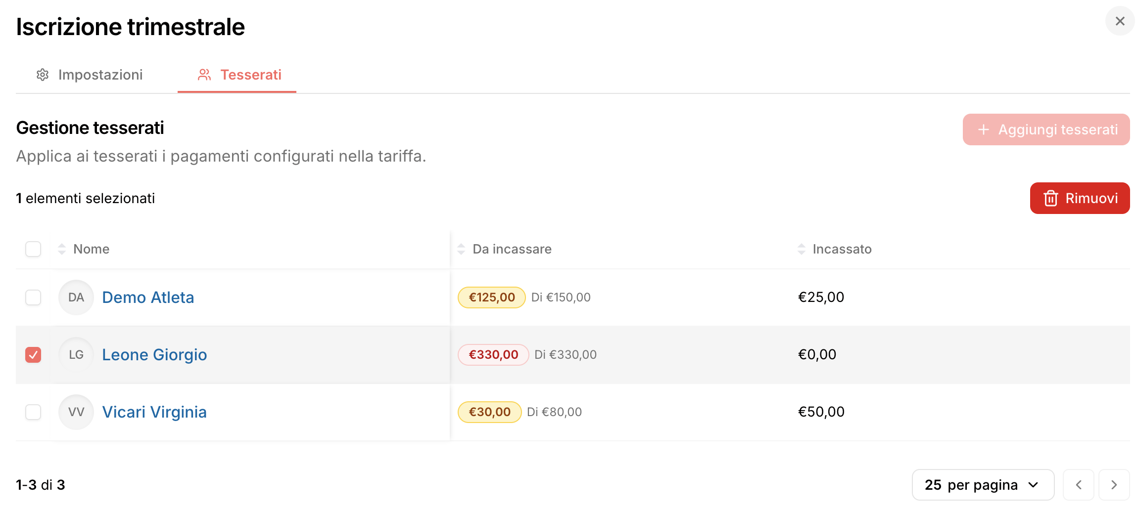 Aprendo il tesserato nell’area I Tuoi Tesserati, nella sezione Atleti, seleziona il profilo e vai nella sua area Pagamenti e clicca su Applica.