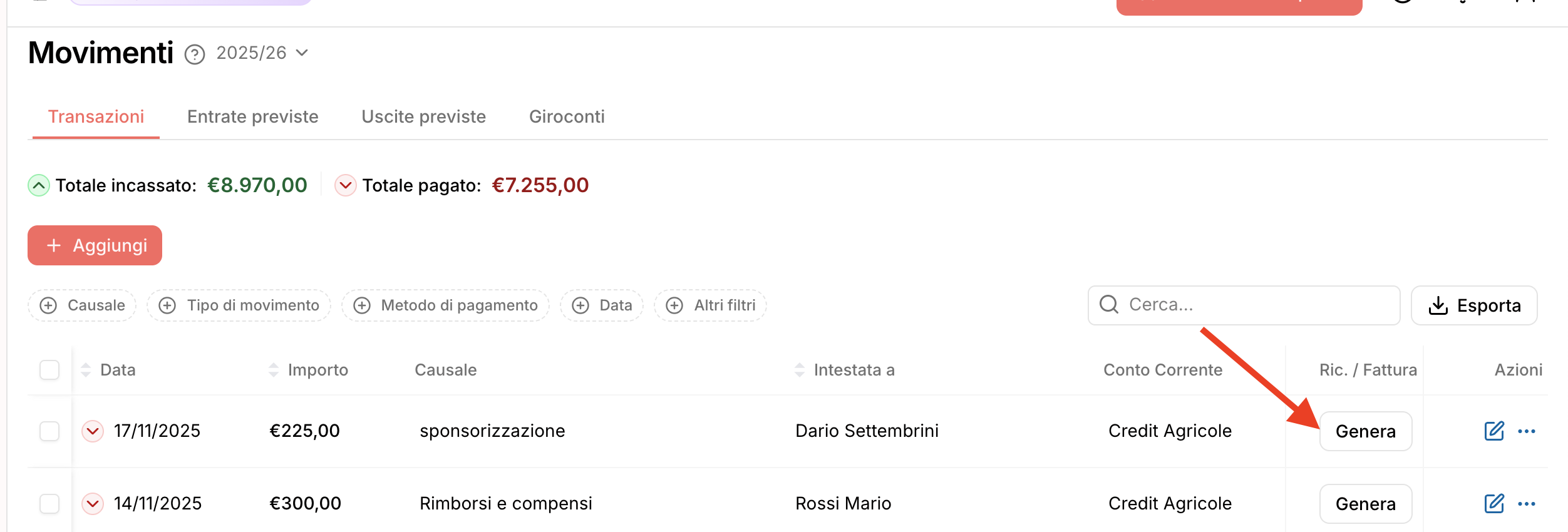 Una volta creata, potrai generare la fattura cliccando sul bottone “Genera” di fianco al movimento: