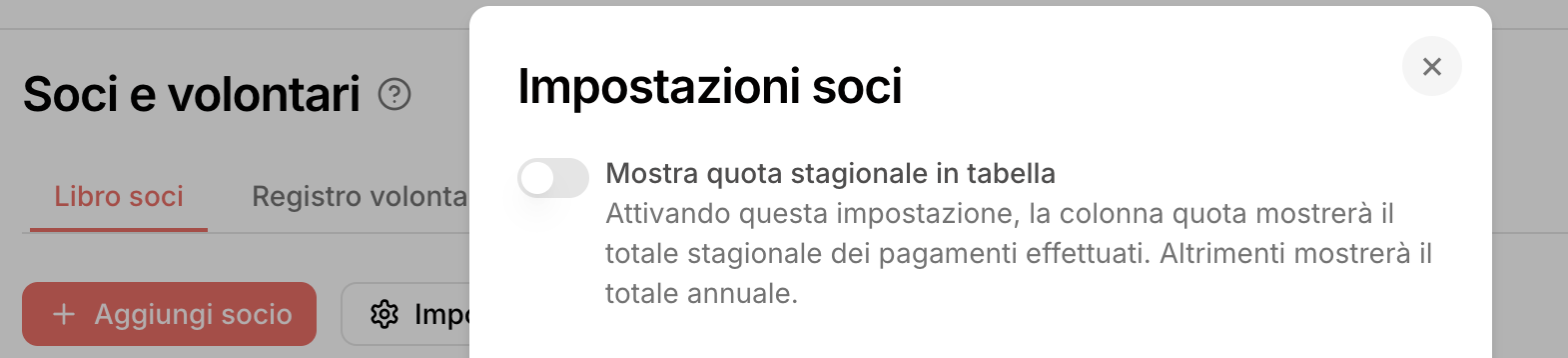 Dal libro soci, cliccando su "impostazioni" puoi decidere se includere nel tuo libro soci tutte le quote pagate nella stagione sportiva o nell'anno solare in corso: