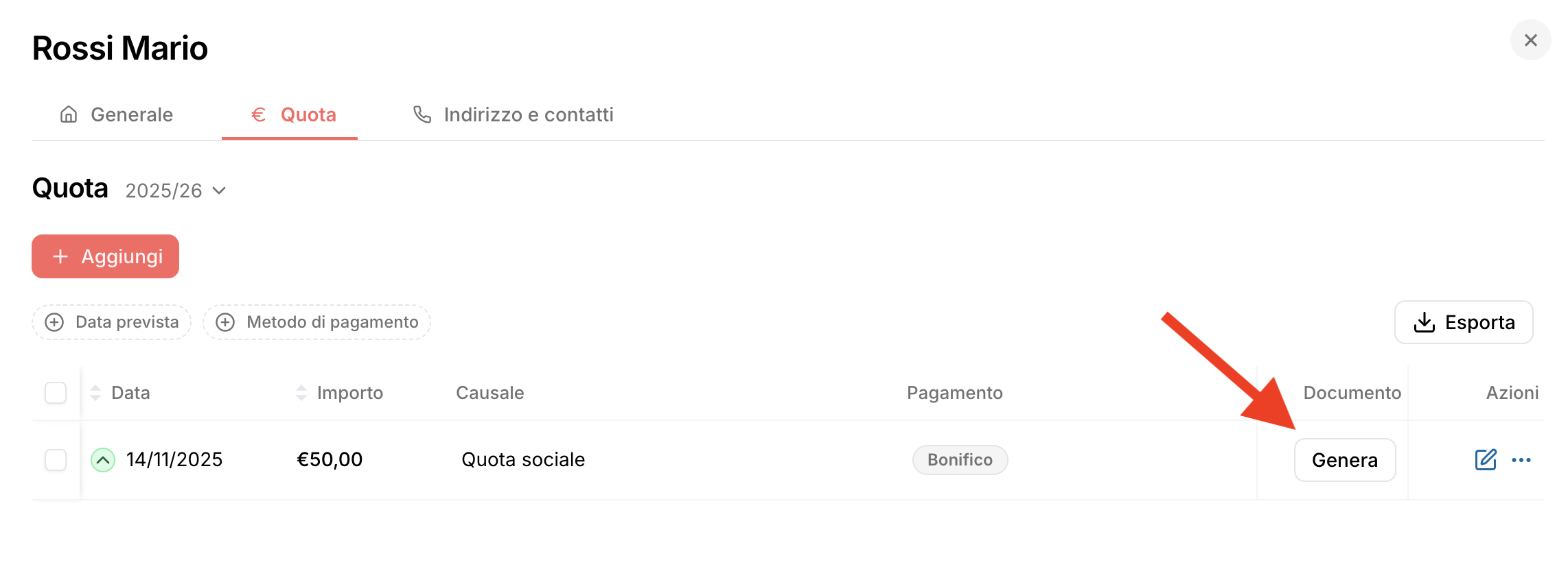 Direttamente dall'area "pagamenti" dell'atleta / dello staff o dall'anagrafica del socio, dopo aver registrato un pagamento incassato per quota sociale, puoi generare a ricevuta di pagamento cliccando su genera -> ricevuta.