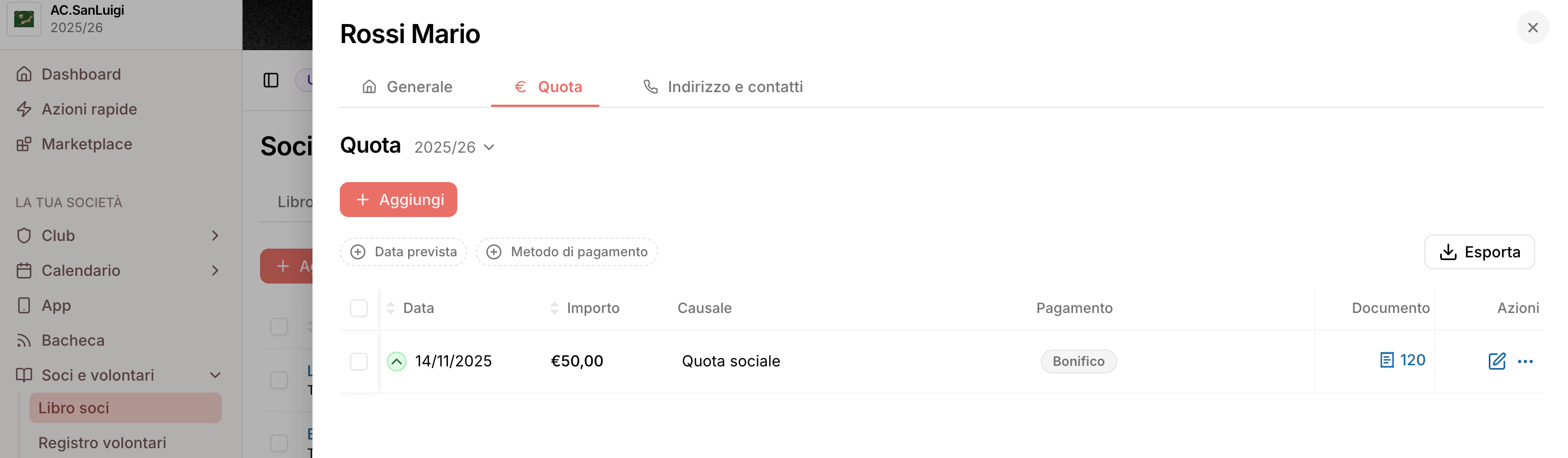 - Se i soci sono figure esterne (ma anche staff o genitori) puoi creare il pagamento della quota sociale direttamente dalla loro anagrafica presente in libro soci.
