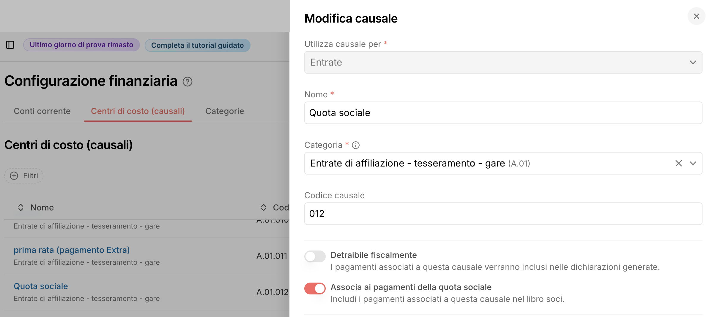 Quando la crei potrai specificare il nome (es. quota sociale o associativa) e associarla ai pagamenti del libro soci, così da trovare più rapidamente le rate incassate nel tuo libro soci: