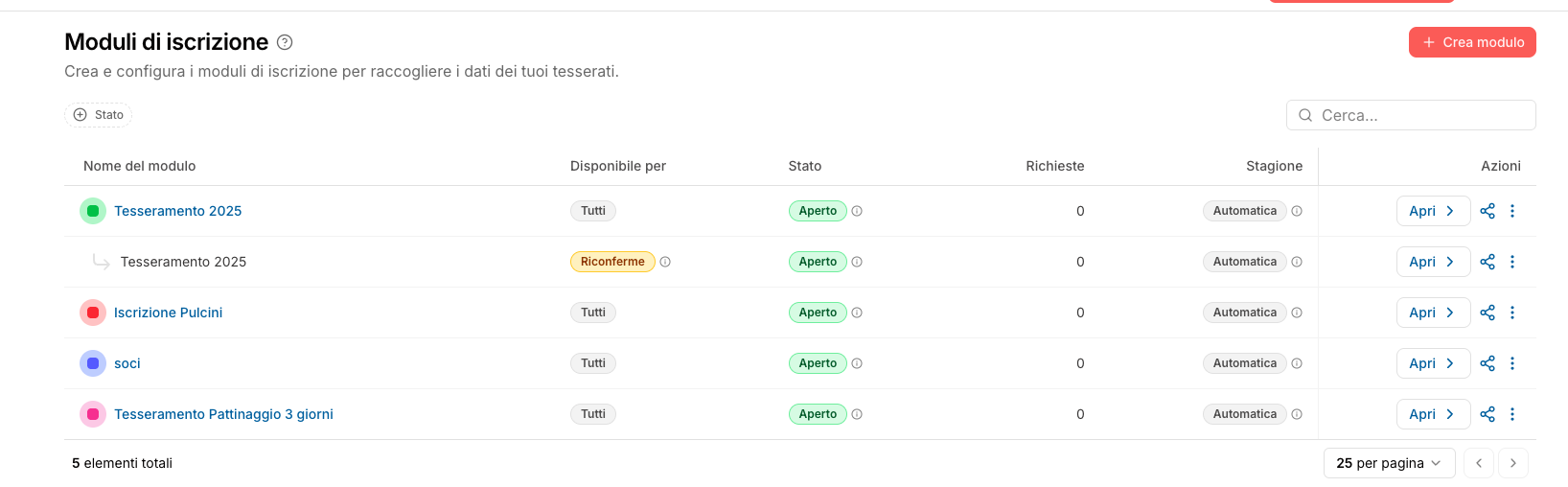 Dalla sezione "iscrizioni" del menù puoi cliccare su "Crea modulo" per creare il tuo primo modulo. Una volta salvato, potrai condividere il modulo in più modalità: