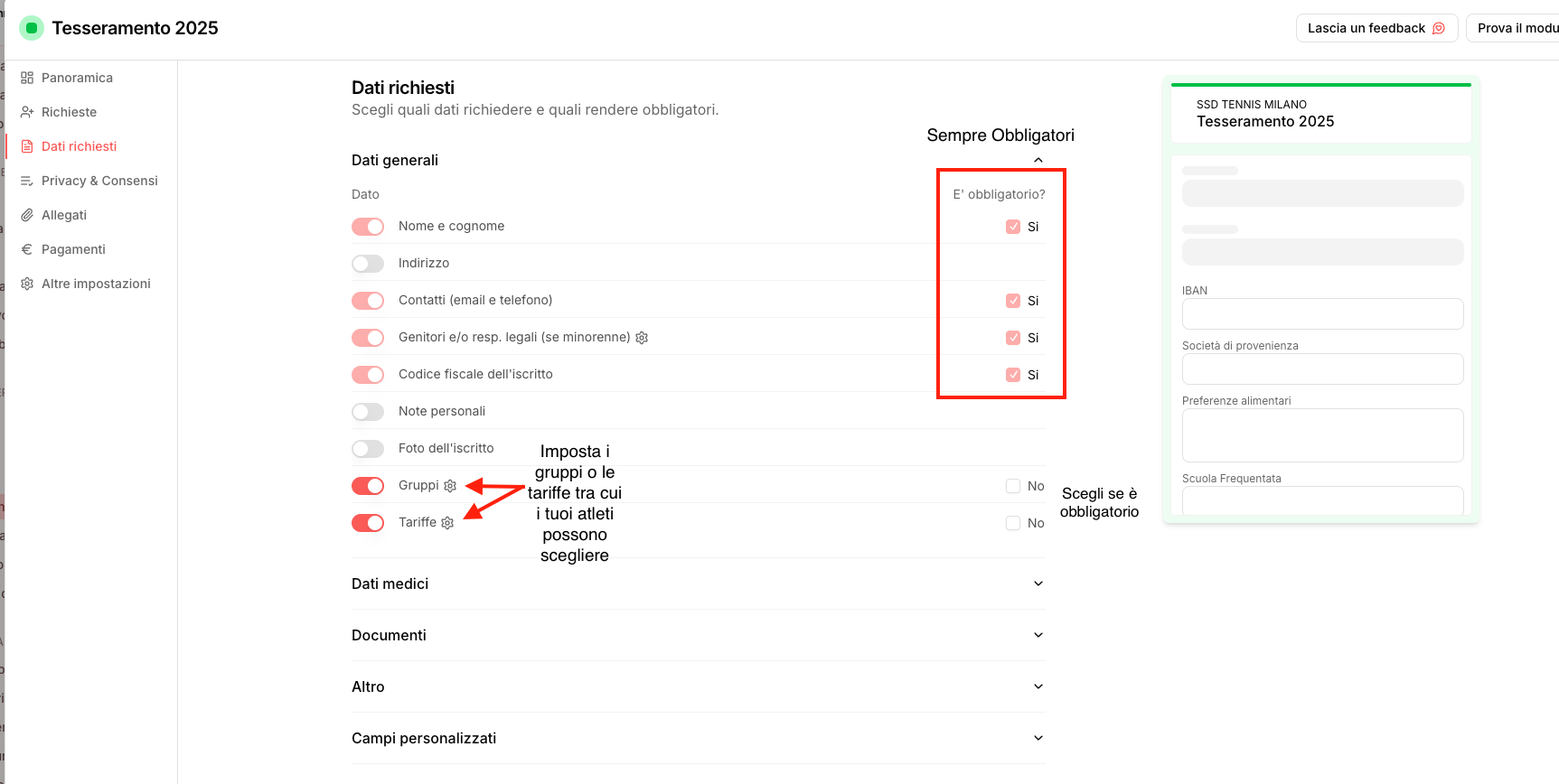 Ultimo, ma non meno importante, nel tuo modulo di iscrizione puoi richiedere che il tesserato o il genitore carichi un allegato come il documento di identità o la copia della visita medica. Per richiedere il caricamento puoi cliccare su "Aggiungi" e dare un nome all'allegato richiesto.