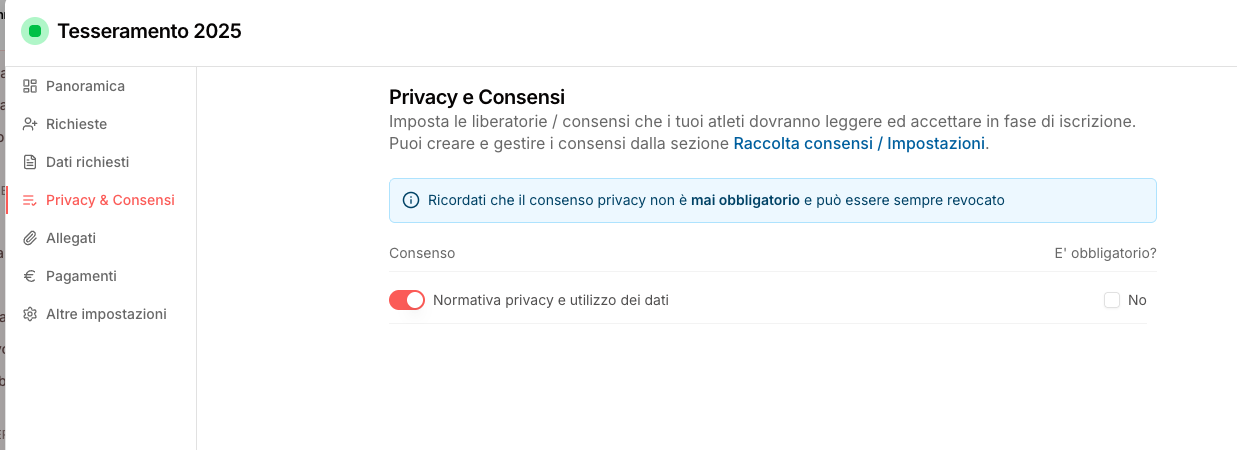 In questa sezione nel tuo link di iscrizione puoi configurare consensi privacy che il tesserato o il genitore dovranno accettare in fase di compilazione. Puoi utilizzarlo per ottenere consensi sul regolamento della società o sull'utilizzo delle foto per fini commerciarli.