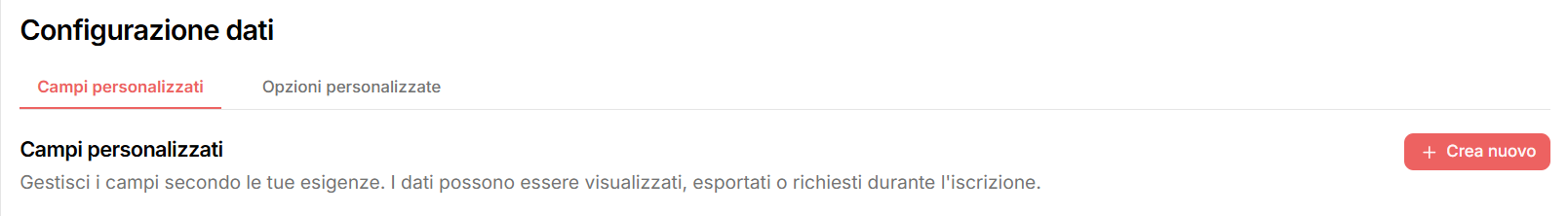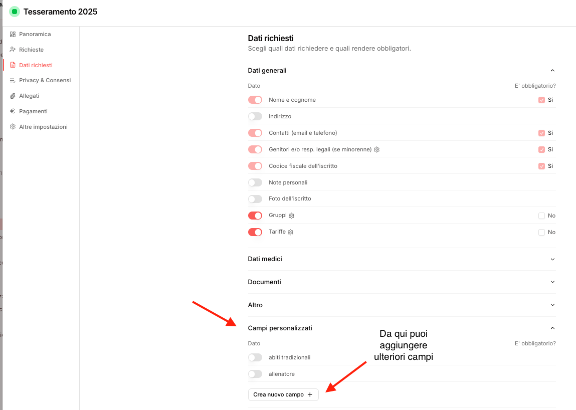 Da qui cliccando su Crea nuovo campo potrai aggiungere un nuovo dato da richiedere ai tesserati nel momento dell'iscrizione, rendendolo obbligatorio o meno.