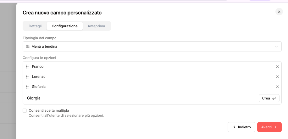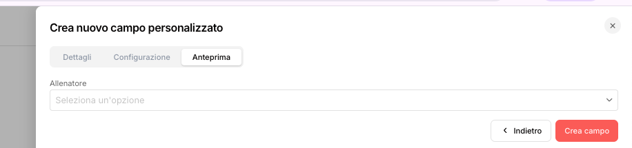 Cliccando avanti potrai visualizzare un'anteprima di quello che i tuoi tesserati vedranno nel modulo. Nota che questa anteprima è solo illustrativa e non salva dati nel gestionale. Cliccando Crea Campo sarà possibile visualizzarlo tra i campi personalizzati all'interno del menù iscrizione, dati richiesti.