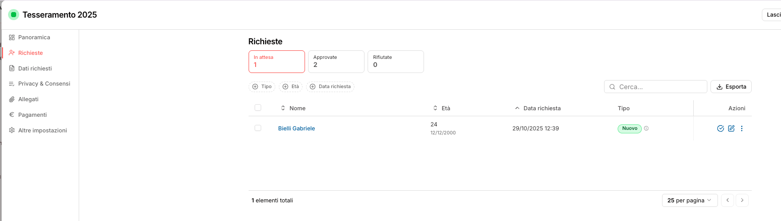 Quando approvi l'iscrizione, puoi controllare (nel caso di pagamento facoltativo) se il tesserato ha pagato o meno e approvarla o rifiutare la richiesta: